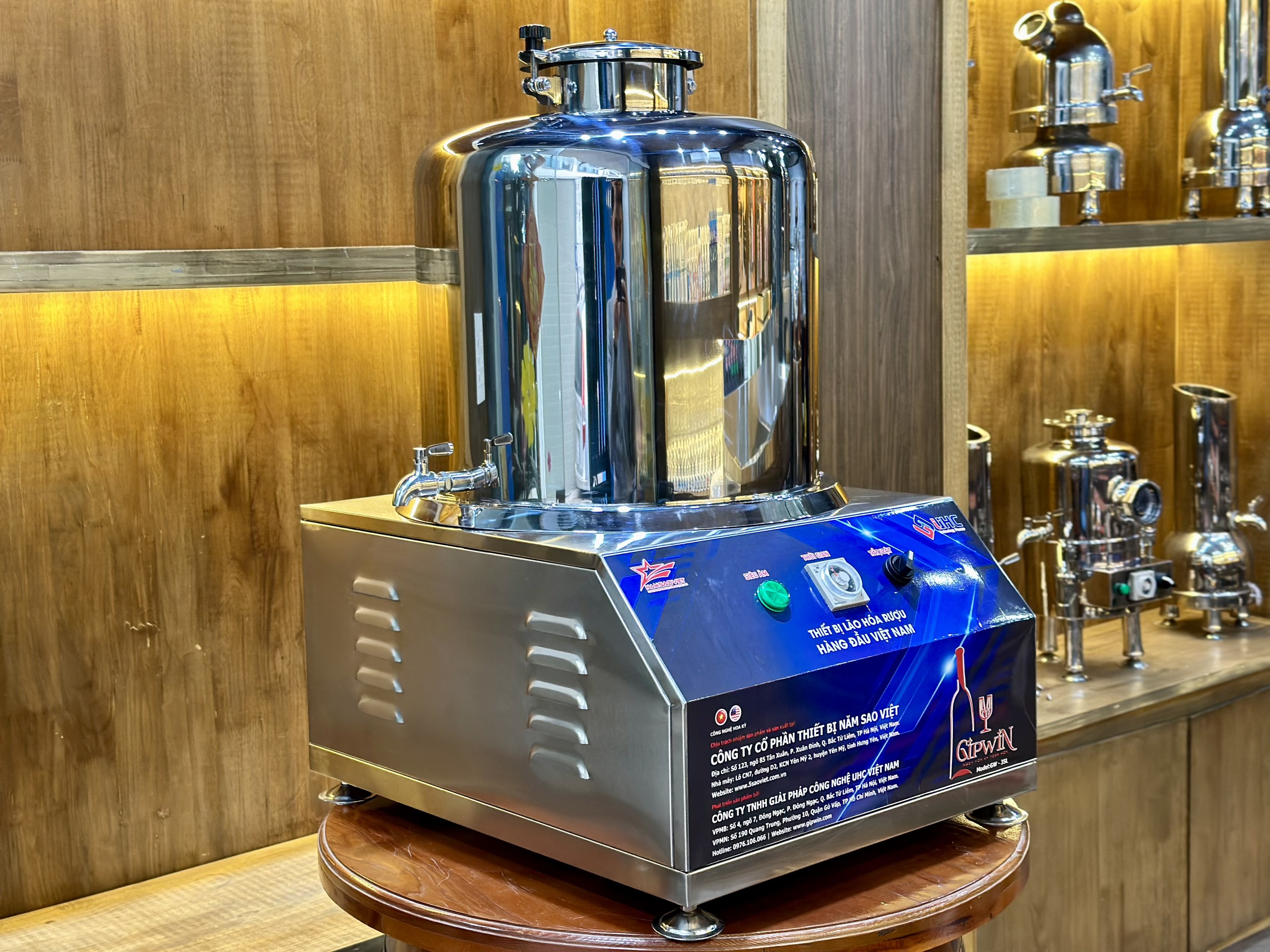 Sản phẩm Máy lão hóa rượu Gipwin 35L là thiết bị làm tăng tuổi thọ và khử độc tố của rượu. Đây là sản phẩm được chuyển giao công nghệ và hơp tác nghiên cứu giữa công ty TNHH giải pháp công nghệ UHC Việt Nam và các chuyên gia của Hoa Kỳ. Được cấp bằng sáng chế lần đầu tiên tại Hoa Kỳ số US2086891A ngày 13 tháng 7 năm 1937. Công nghệ nhằm tác động vật lý tới các thành phần có trong dung dịch rượu tạo ra những thay đổi hóa học của các chất giống như việc để lão hóa trong tự nhiên.