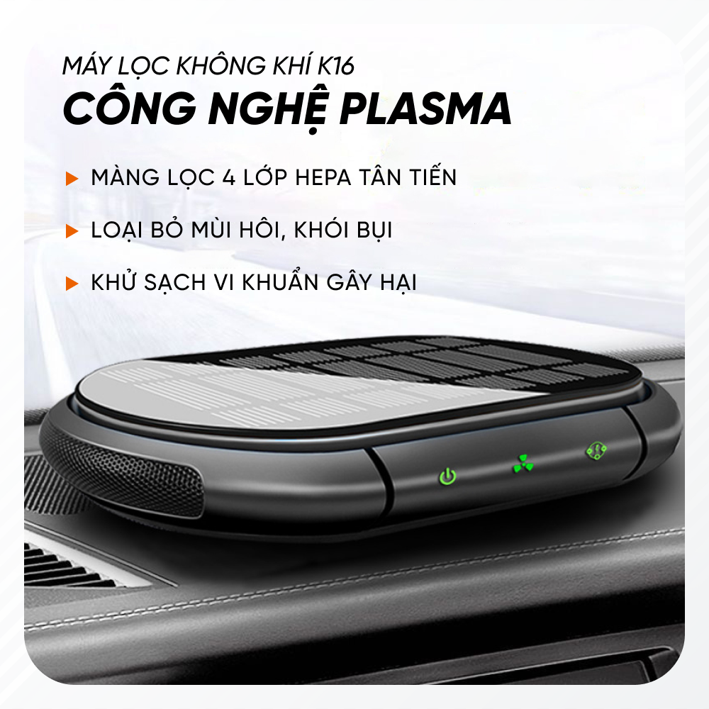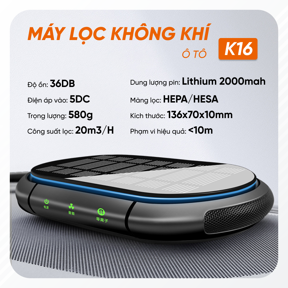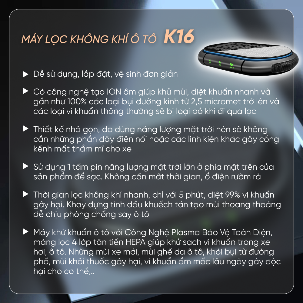 Máy Lọc Không Khí Mini K16 Sử Dụng Cho Xe Ô Tô Bạn đang tìm kiếm một giải pháp tiện ích cho không gian lái xe thân thương của mình? Máy lọc không khí trên xe ô tô sử dụng năng lượng mặt trời là sự lựa chọn hoàn hảo cho bạn! Với công nghệ tiên tiến, sản phẩm này không chỉ loại bỏ hiệu quả vi khuẩn, vi rút và các hạt bụi trong không khí, mà còn giúp giữ cho không gian bên trong xe luôn trong lành và sạch sẽ. Đặc biệt, máy lọc này được tích hợp pin năng lượng mặt trời, tiết kiệm năng lượng và thân thiện với môi trường. Dễ dàng lắp đặt và vận hành, sản phẩm này là một đối tác đáng tin cậy trong mỗi chuyến đi của bạn. Hãy đặt hàng ngay hôm nay để trải nghiệm sự thoải mái và an toàn khi lái xe!" THÔNG TIN SẢN PHẨM : Mã sản phẩm : K16 Độ ồn: 36DB Điện áp vào: 5DC Công suất lọc: 20m3/H Màng lọc: HEPA/HESA Dung lượng pin : Lithium 2000mah Kích thước: 136x70x10mm Trọng lượng : 580g Phạm vi hiệu quả : <10m2 TÍNH NĂNG NỔI BẬT : Máy lọc không khí ô tô ION âm K16 sạc năng lượng mặt trời thiết bị khử mùi khảng khuẩn dành cho xe hơi Thời gian lọc không khí nhanh, chỉ với 5 phút, diệt 99% vi khuẩn gây hại. Khay đựng tinh dầu khuếch tán tạo mùi thoang thoảng dễ chịu phòng chống say ô tô Sử dụng 1 tấm pin năng lượng mặt trời lớn ở phía mặt trên của sản phẩm để sạc. Không cần mất thời gian, ổ điện rườm rà Thiết kế nhỏ gọn, do dùng năng lượng mặt trời nên sẽ không cần những phần dây điện nối hoặc các linh kiện khác gây cồng kềnh mất thẩm mĩ cho xe Có công nghệ tạo ION âm giúp khử mùi, diệt khuẩn nhanh và gần như 100% các loại bụi đường kính từ 2,5 micromet trở lên và các loại vi khuẩn thông thường sẽ bị loại bỏ khi đi qua lọc Dễ sử dụng, lắp đặt, vệ sinh đơn giản Tính năng tự động bật tắt cảm biến theo sự di chuyển của xe.