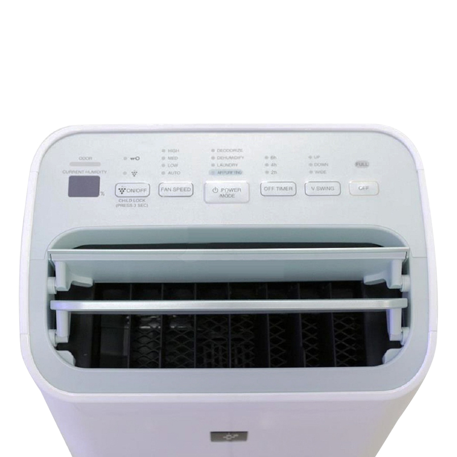 Mặt trước máy có in logo hãng màu xám, nhỏ khẳng định đẳng cấp của thương hiệu. Bảng điều khiển bằng nút bấm được chú thích bằng chữ và hình vẽ rất dễ hiểu, đồng thời mang lại sự hiện đại cho thiết bị.