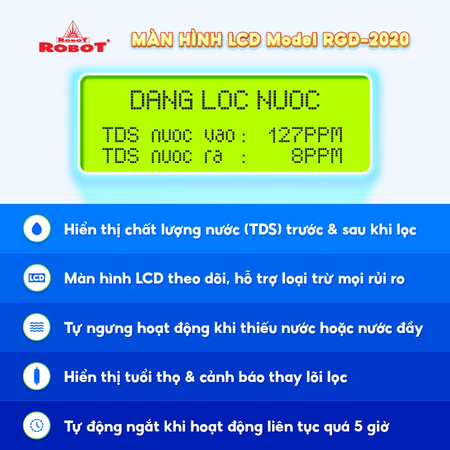 • Công nghệ RMC – LCD độc quyền, biết được chất lượng nước trước & sau lọc Bộ vi mạch RMC-LCD thông minh thiết kế phát minh của ROBOT, mọi chi tiết vận hành máy được hiển thị trên màn hình LCD, cảnh báo mọi rủi ro cho người sử dụng   Tuổi thọ lõi lọc được tính theo lưu lượng nước sử dụng, không tính theo thời gian ghim điện như các máy thông thường, tiết kiệm tối đa chi phí thay lõi lọc.