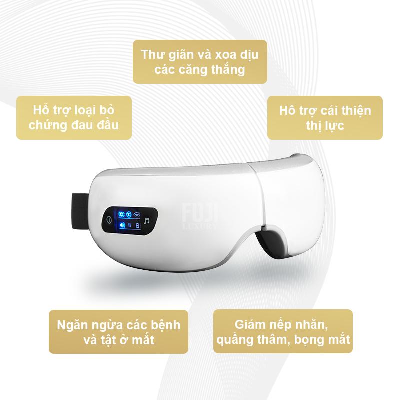 Giúp thúc đẩy tuần hoàn máu, giảm mệt mỏi và căng thẳng xung quanh mắt. Co bóp và ép túi khí nhịp nhàng khu vực xung quanh mắt, giúp thúc đẩy giãn nở mạch máu, lưu thông khí huyết, hỗ trợ giảm quầng thâm mắt