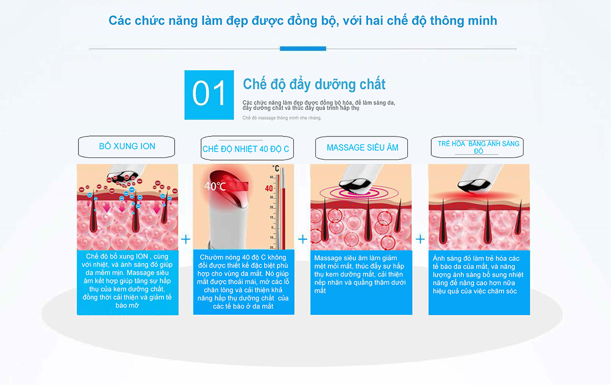 - Chức năng : Xoá vết thâm và vết nhăn bọng mắt , hỗ trợ di tinh chất, trẻ hoá da bằng ánh sáng photon xanh đỏ