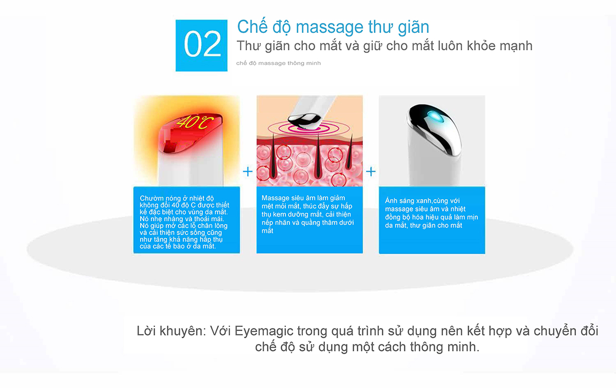 - Nên sử dụng sản phẩm hai ngày một lần, mỗi lần sử dụng từ 3-5 phút cho một bên mắt. Thời gian sử dụng không thể quá dài; tốt nhất là sử dụng trước khi ngủ. Hoặc bạn có thể lập kế hoạch chăm sóc phù hợp với bản thân và tình trạng da mắt của bạn. Nếu bạn tạm thời bị bệnh về mắt, vui lòng tạm ngừng sử dụng.