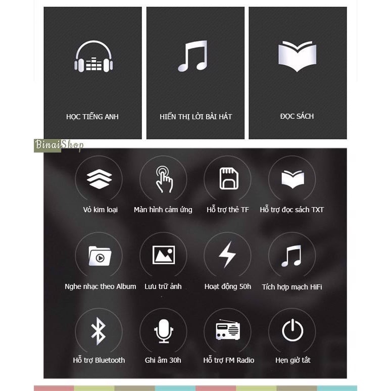 Sản phẩm được tích hợp chip giải mã Hifi với độ phân giải cao APE - FLAC các định dạng LOSSLES. Bộ nhớ 4GB, hỗ trợ thẻ nhớ TF lên đến 128GB cho phép bạn thưởng thức kho âm nhạc với âm thanh chất lượng cao. Ngoài ra, sản phẩm có tính năng hiển thị lời bài đối với những sản phẩm âm nhạc bản quyền giúp bạn có thể ngân nga theo những giai điệu yêu thích.