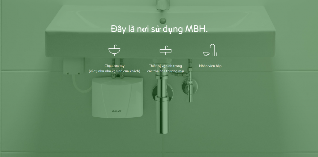 Được thừa hưởng phong cách thiết kế tinh xảo của nền công nghiệp Đức – Các sản phẩm thuộc dòng MBH sở hữu dáng vẻ hiện đại, nhỏ gọn, chắc chắn và cực kỳ tối ưu cho người sử dụng. Công nghệ độc quyền, an toàn tuyệt đối. Kể từ khi thành lập năm 1951, nhờ phát hiện ra khả năng ứng dụng nguyên tắc vật lý cơ bản vào thực tế sản phẩm là dùng trở kháng cao của dòng nước để tạo thành 1 điện trở tự nhiên, giúp cách ly dòng điện đảm bảo an toàn cho người dùng. CLAGE đã triệt để áp dụng nguyên tắc này trong các thiết bị của mình. Hiện tại, CLAGE đang là thương hiệu sở hữu độc quyền công nghệ này trên toàn thế giới. Nhiệt độ nước đầu ra được kiểm soát tối ưu, hoàn toàn không cần pha thêm nước lạnh để đạt được nhiệt độ nước mong muốn, cũng không cần lo lắng về nhiệt độ nước quá nóng gây nguy hiểm cho người dùng. Theo các thông số kỹ thuật như công suất máy, dòng điện đầu vào và lưu lượng nước đầu ra, máy nước nóng tức thì dòng MCX sẽ được chia thành MBH 3, MBH 4, MBH 6, MBH 7.