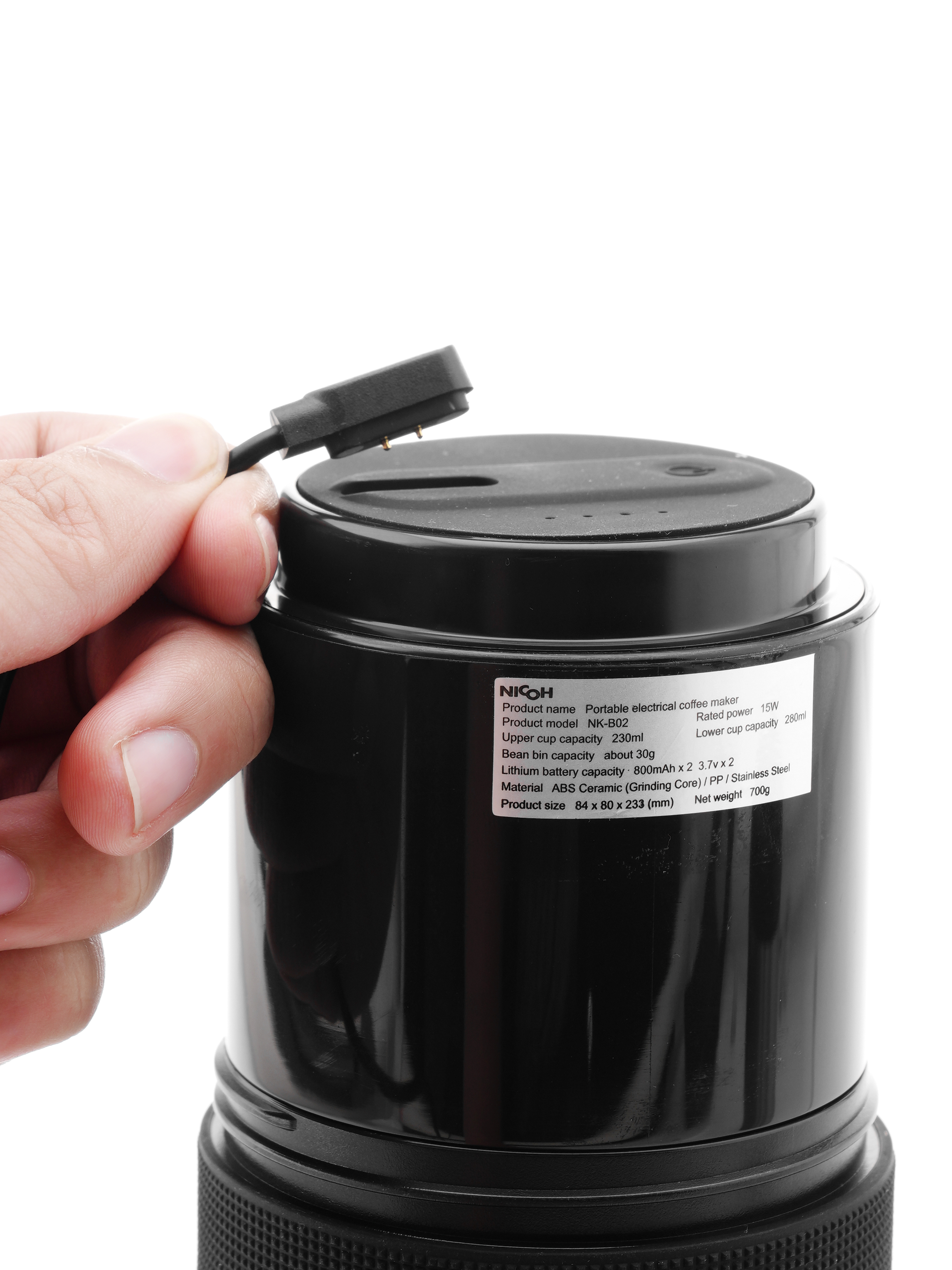 Đầu nối sạc từ tính để sạc nhanh, khi sạc đầy có thể pha ra 20 tách cafe