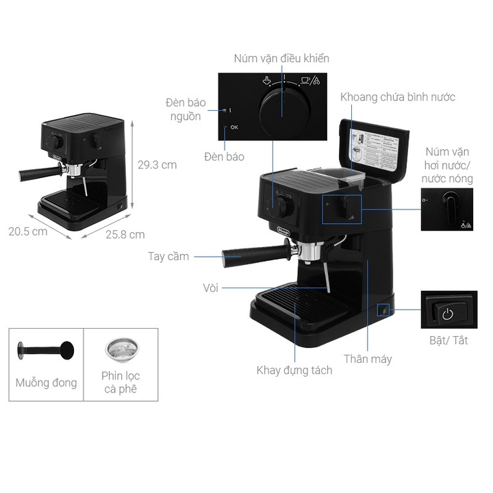 ✨Máy pha cà phê Delonghi EC235.BK công suất 1100W, pha Espresso đánh bọt sữa capuchino, latte - Hàng nhập khẩu