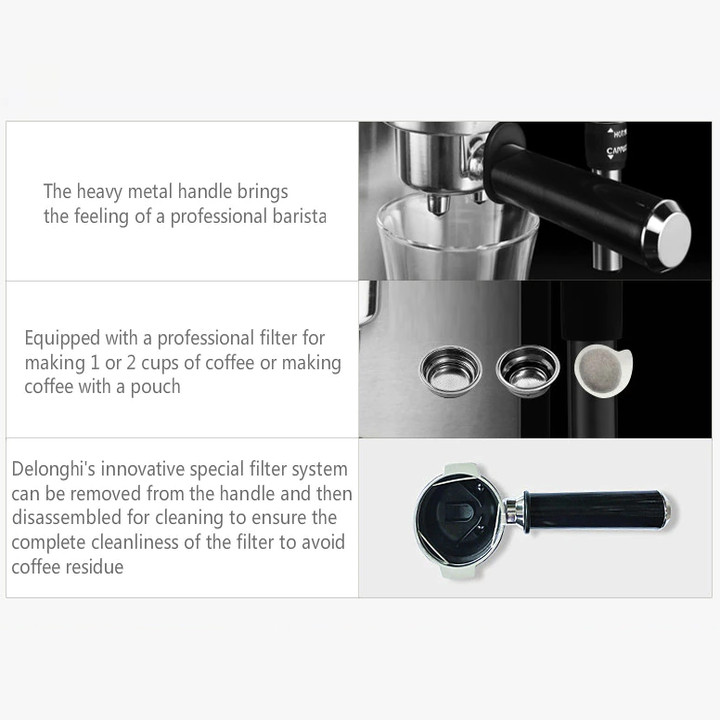 - Máy pha Delonghi có công suất hoạt động mạnh mẽ lên đến 1100W, máy được hoạt động bằng điện, không cần mất nhiều thời gian để chờ đợi cafe pha xong với thao tác đơn giản, người dùng chỉ cần bỏ bột cafe vào lưới lọc, đổ nước vào máy, đóng nắp lại, đặt bình vào đúng vị trí để cà phê chảy vào bình và nhấn nút khởi động, đèn báo sáng sẽ sáng lên báo hiệu máy đã hoạt động và chờ vài phút là sẽ có ngay những ly cafe thơm ngon để thưởng thức. Hệ thống điều chỉnh bọt sữa thông minh