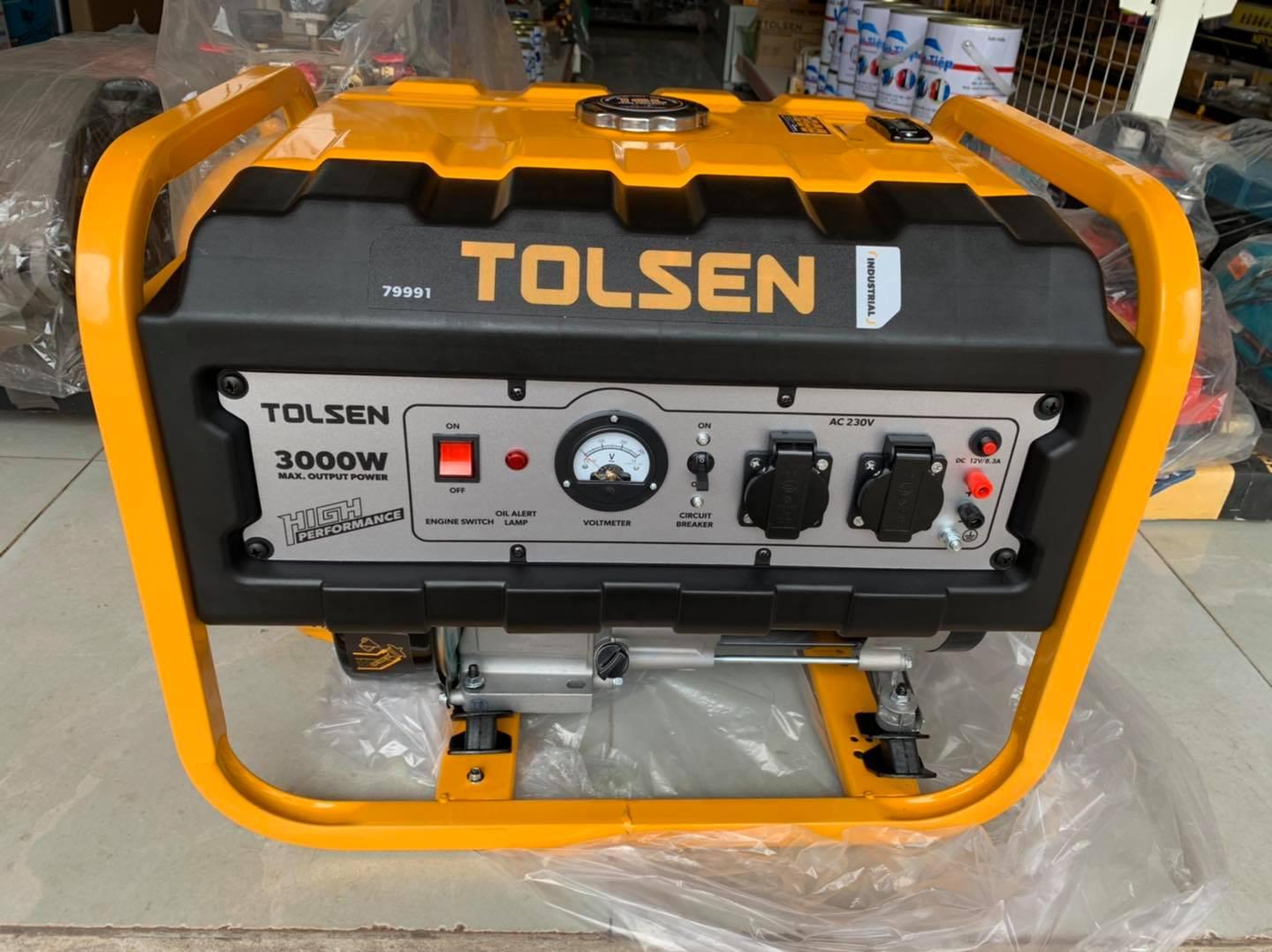 Thông số kĩ thuật -Mã sản phẩm: 79991 -Thương hiệu: TOLSEN -Xuất xứ: Trung Quốc -Đầu ra định mức: 2800w -Tối đa công suất đầu ra: 3000w -Điện áp định mức: 220V -Tần số định mức: 50Hz -Loại động cơ: Xylanh đơn, 4 kỳ, làm mát bằng gió -Dung tích động cơ: 212cc -Hệ thống đánh lửa: TCI ( CÔNG TẮC BÁN DẪN) -Hệ thống khởi động: giật -Dung tích thùng nhiên liệu: 16L -Thời gian hoạt động liên tục: 10 giờ -Trọng lượng tịnh: 44,85kgs