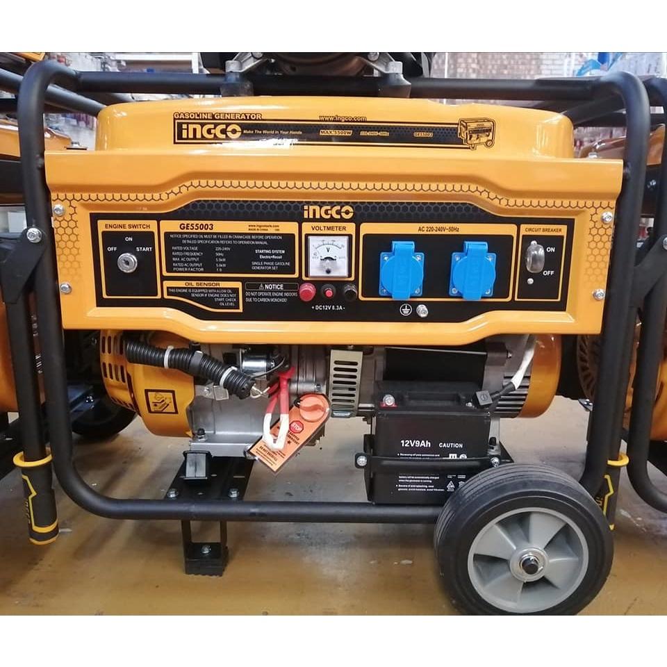 Model này được tích hợp nhiều công nghệ mới của INGCO nên đỡ tốn nhiên liệu và thân thiện với môi trường. Máy phát điện INGCO GE55003 dùng nhiên liệu xăng có công suất tối đa là 5.5KVA, đây là dòng sản phẩm mới được sản xuất bởi dây chuyền công nghệ hiện đại hàng đầu của nhà máy INGCO Trung Quốc, được kiểm định chất lượng nghiêm ngặc trước khi đến tay người tiêu dùng. Sản phẩm hoạt động bằng xăng (thùng đựng xăng dung tích 25 lít), có công suất mạnh 5.5kVA phát điện tốt trong gia đình, xưởng chế tạo, công trường làm việc, trường học, bệnh việ máy có động cơ 4 thì, OHV và được làm mát bằng quạt gió tránh rơi vào trạng thái quá tải, quá nhiệt.