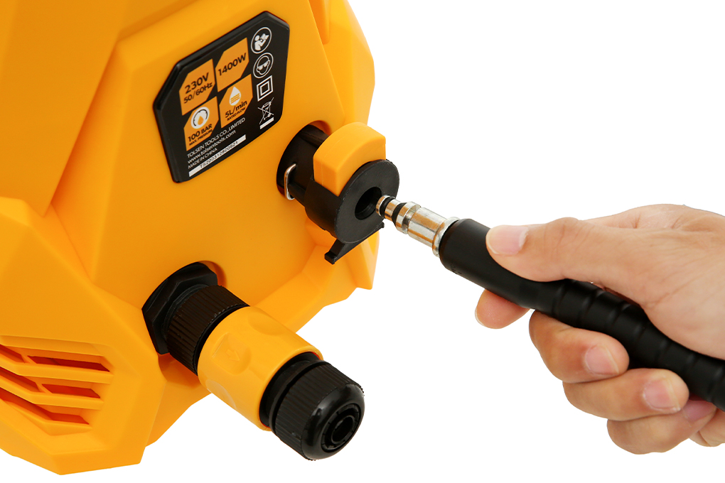 Máy rửa xe đạt công suất 1400 W và cho lực phun mạnh tối đa lên tới 100 bar, giúp bạn loại bỏ dễ dàng các vết bẩn bụi bẩn bám trên xe hoặc dưới gầm xe, rửa xe một cách nhanh chóng, tiện lợi hơn.