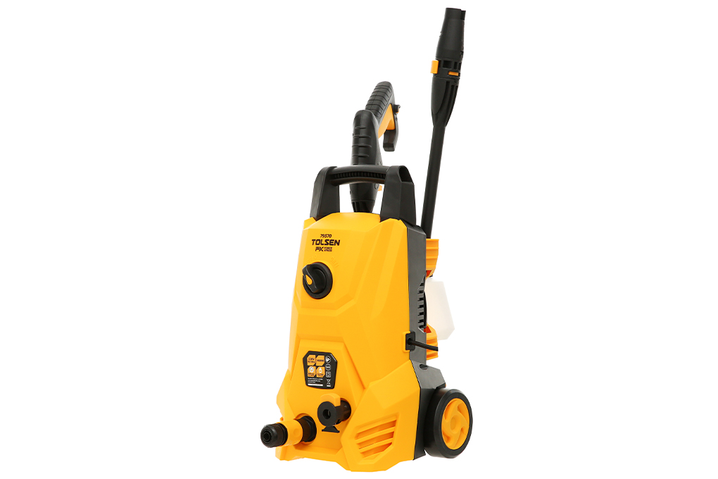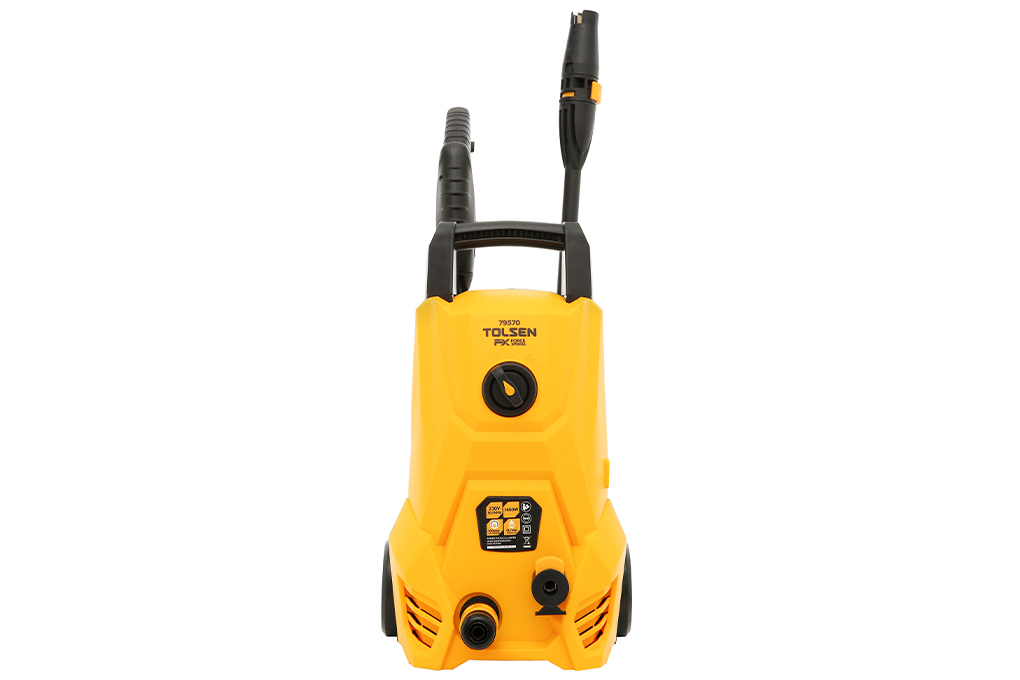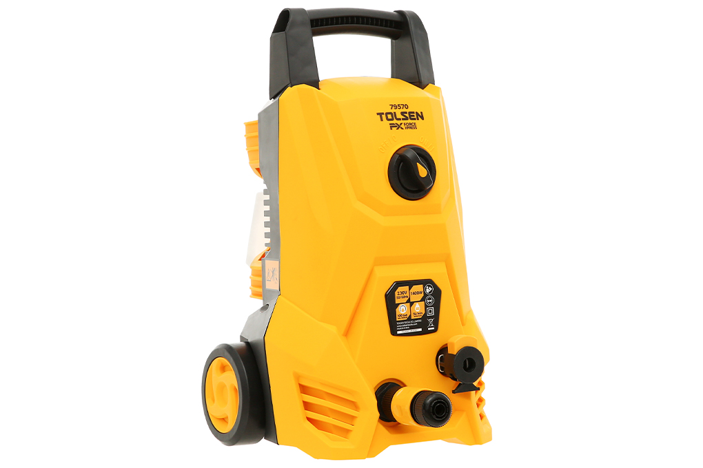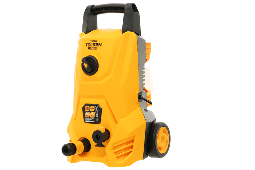 Máy phun xịt rửa áp lực cao Tolsen 79570 1400W có thiết kế nhỏ gọn với gam màu vàng - đen bắt mắt, dễ dàng phân biệt với các dụng cụ khác trong gia đình. Máy được trang bị dây phun dài 5m và bánh xe tiện lợi, giúp bạn có thể dễ dàng di chuyển trong quá trình sử dụng.