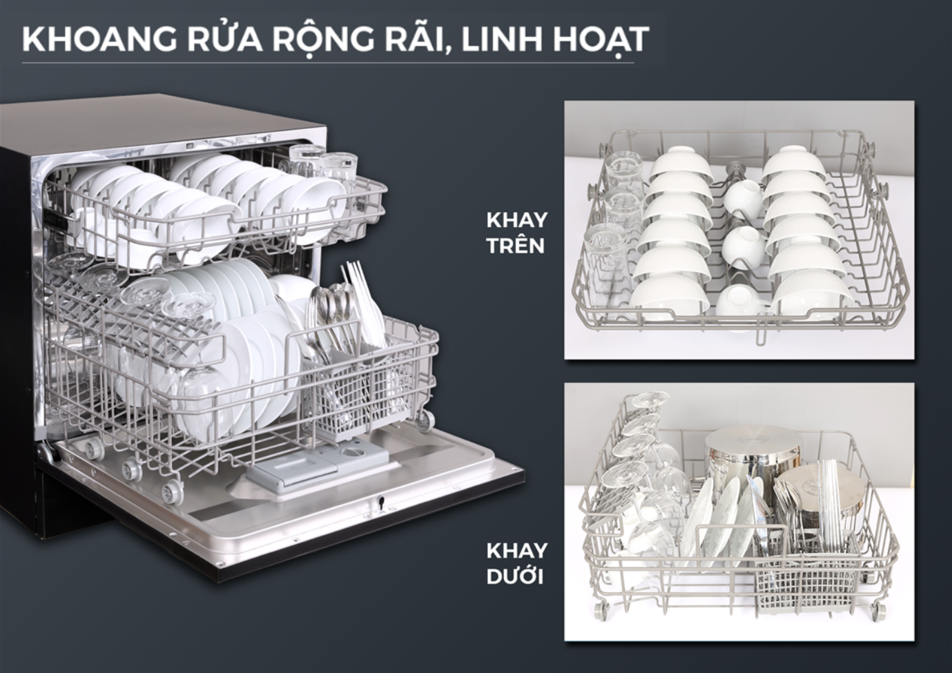 • Máy rửa chén độc lập • Thân inox màu đen cao cấp • 3 dàn rửa tiện lợi • Sức chứa 17 bộ đồ ăn Châu Âu • 8 Chương trình rửa tích hợp