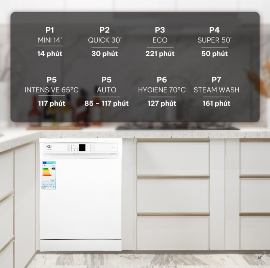 MÁY RỬA CHÉN KUCHEN KUPP 80356 Thế hệ cảm biến tải trọng mới nhất giúp tối ưu chương trình rửa để đảm bảo tiết kiệm điện và tiết kiệm nước nhất mà lại đảm bảo độ sạch và khô cao nhất. Bơm cao áp không chổi than bền bỉ và êm ái theo thời gian. KUPP80356 với dung tích full size có thể rửa lên đến 13 bộ chén đĩa, cùng với xoong nồi, thớt chặt, chảo rán… Cùng với đó là 3 tầng rửa có thể điều chỉnh kích thước, đem đến sự tiện lợi và thoải mái cho người sử dụng. Bảng điều khiển điện tử, màn hình full chức năng với phím bấm to và rõ, bố trí thông minh và hợp lý, tạo cảm giác thân thiện cho bất cứ ai cũng có thể dễ dàng sử dụng và điều khiển. 8 chế độ rửa cùng 6 mức nhiệt độ rửa khác nhau nhằm tối ưu hóa công đoạn rửa, cho bát đĩa luôn sạch sẽ, hợp vệ sinh, rửa trôi các thực phẩm, hóa chất tồn dư đọng lại trên bát đĩa, diệt sạch vi khuẩn, an toàn hơn so với khi rửa bằng tay theo cách thông thường. Các chương trình rửa: Chương trình Thời lượng (phút) Miêu tả P1 Mini 14’ 14 Chương trình nhanh nhất dành cho bát đĩa ít bẩn và mới sử dụng P2 Quick 30’ 30 Thích hợp cho bát đĩa bẩn nhẹ và rửa nhanh P3 Eco 221 Chương trình tiêu chuẩn dành cho bát đĩa thường bị bẩn hàng ngày với mức tiêu thụ năng lượng và nước tiết kiệm P4 Super 50’ 50 Thích hợp cho các món ăn hàng ngày bị bẩn bình với chương trình nhanh hơn  P5 Intensive 65°C 117 Thích hợp cho bát đĩa bẩn nhiều, rửa ở 65°C Auto 85 – 117 Chương trình tự động thích hợp cho bát đĩa bẩn nhiều P6 Hygiene 70°C 127 Thích hợp cho bát đĩa bẩn nặng cần diệt khuẩn ở 70°C P7 Steam Wash 161 Thích hợp cho bát đĩa bị bẩn nhiều với khả năng làm sạch hiệu quả bằng hơi nước   CÁC TÍNH NĂNG ĐẶC BIỆT CỦA MÁY: