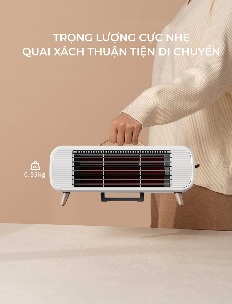 Thiết kế nhỏ gọn, tiện dụng Sưởi ấm nhanh, không gây tiếng ồn 3 mức phát nhiệt Có tính năng quay đảo hướng phát nhiệt, phạm vi phát nhiệt rộng Lưới tản nhiệt thiết kế