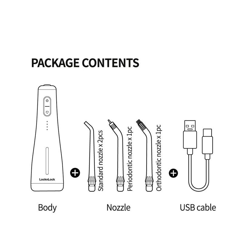 Máy tăm nước không dây LocknLock ENR154WHT 250ml, Hàng chính hãng, 4 chế độ, dung lượng pin 2000mAh - JoyMall THÔNG TIN SẢN PHẨM Màu trắng Bộ sản phẩm bao gồm: Thân máy, 4 đầu