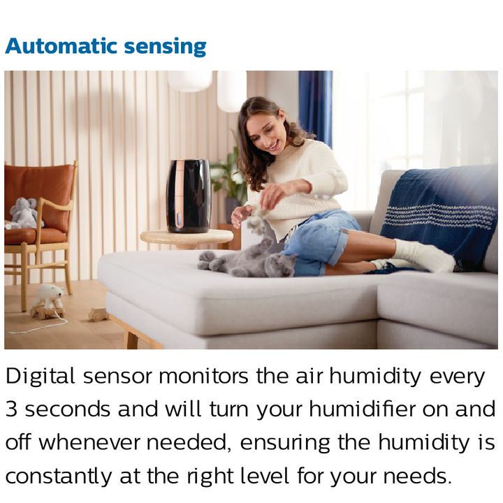 - Cảm biến kỹ thuật số theo dõi độ ẩm không khí 3 giây một lần và sẽ bật độ ẩm của bạn bất cứ khi nào cần, đảm bảo độ ẩm luôn ở mức phù hợp với nhu cầu của bạn chính xác độ ẩm. Máy cũng cung cấp mức độ ẩm phòng bằng số theo thời gian thực.