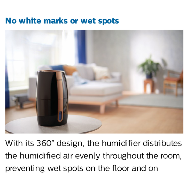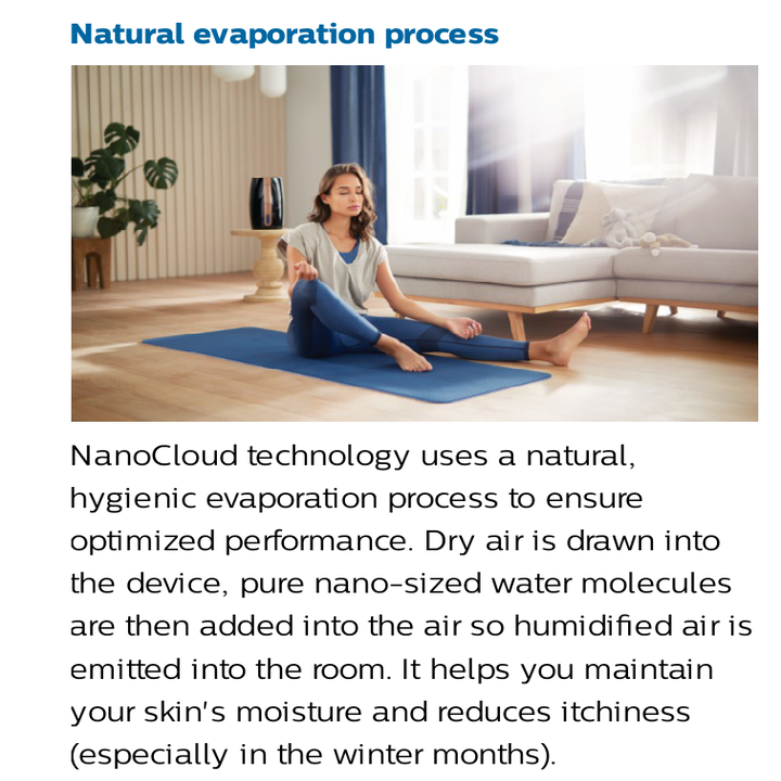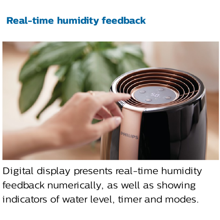 - Chức năng hẹn giờ: 1~9 giờ. Khi kết thúc thời gian hẹn giờ máy sẽ tự động tắt. - Phát tán ít vi khuẩn hơn 99%. Vì các phân tử hơi nước rất nhỏ nên chúng ít có khả năng mang vi khuẩn vào không khí hơn. Thử nghiệm trong phòng thí nghiệm của chúng tôi cho thấy rằng công nghệ NanoCloud lây lan vi khuẩn ít hơn 99% so với công nghệ tạo ẩm siêu âm - Quá trình bay hơi tự nhiên. Công nghệ NanoCloud sử dụng quy trình bay hơi tự nhiên, hợp vệ sinh để đảm bảo hiệu suất tối ưu. Không khí khô được hút vào thiết bị, các phân tử nước tinh khiết có kích thước nano sau đó được thêm vào không khí để không khí ẩm được thải vào phòng. Nó giúp bạn duy trì độ ẩm cho da và giảm ngứa (đặc biệt là trong những tháng mùa đông). - Không có vết trắng hoặc vết ướt: Với thiết kế 360 °, máy tạo ẩm phân phối không khí ẩm đều khắp phòng, ngăn ngừa các vết ẩm ướt trên thiết bị và trên các bề mặt. Công nghệ NanoCloud cũng làm giảm nguy cơ phát tán khoáng chất vào không khí, do đó ngăn ngừa các vết trắng hình thành trên đồ nội thất và các bề mặt khác - Phản hồi độ ẩm thời gian thực. Màn hình kỹ thuật số hiển thị phản hồi độ ẩm theo thời gian thực bằng số, cũng như hiển thị các chỉ báo về mực nước, bộ hẹn giờ và các chế độ ️Máy tạo độ ẩm Philips HU2718/00 tích hợp hệ thống bốc hơi tiên tiến ba giai đoạn với công nghệ NanoCloud.