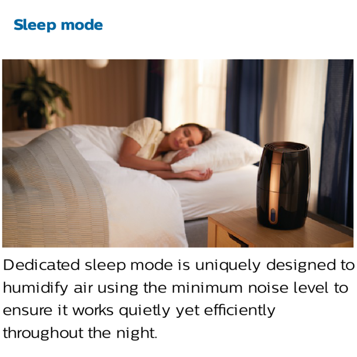 - Chế độ ngủ yên tĩnh. Chế độ ngủ chuyên dụng được thiết kế độc đáo để làm ẩm không khí bằng cách sử dụng mức tiếng ồn tối thiểu để đảm bảo nó hoạt động nhẹ nhàng nhưng êm ái suốt đêm