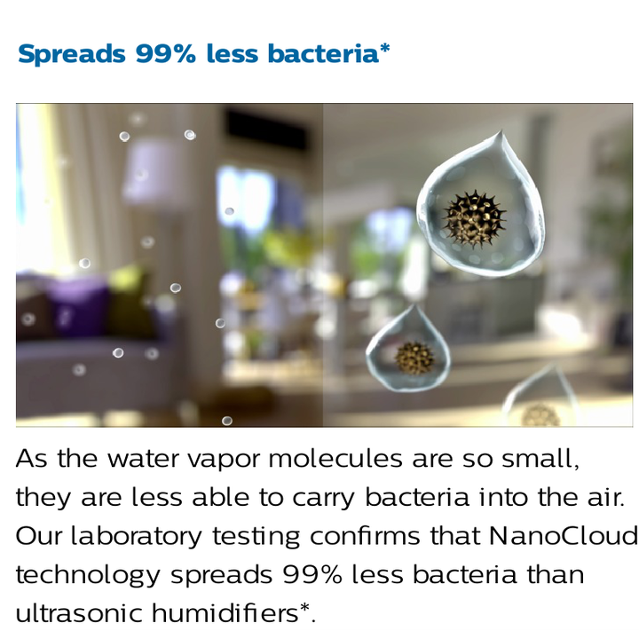 - Những hạt nước với kích cỡ nano nhờ công nghệ xông hơi NanoCloud sẽ giúp giảm đi 99% vi khuẩn trong phòng. -️ Máy làm ẩm của Philips cho phép bạn lựa chọn độ ẩm từ 40, 50 và 60% cho sự thoải mái tối đa. - Đèn báo màu đỏ cho bạn biết bồn chứa nước cần được làm đầy. -️ Khi bồn chứa nước cạn, máy sẽ tự động tắt. -️ Có 3 chế độ lựa chọn tốc độ làm ẩm: Thấp, bình thường và nhanh. Thông số kỹ thuật: