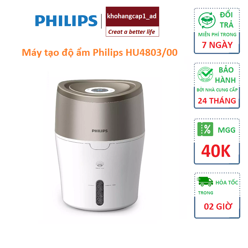 - Những hạt nước với kích cỡ nano nhờ công nghệ xông hơi NanoCloud sẽ giúp giảm đi 99% vi khuẩn trong phòng. -️ Không khí ẩm được phân bổ 360 độ đồng đều và khắp căn phòng. -️ Máy làm ẩm của Philips cho phép bạn lựa chọn độ ẩm từ 40, 50 và 60% cho sự thoải mái tối đa. -️ Chế độ tự động sử dụng cảm biến số để liên tục theo dõi độ ẩm. Nó điều chỉnh việc tạo độ ẩm lên và xuống khi cần thiết, đảm bảo độ ẩm luôn ở chế độ đã được chọn trước.