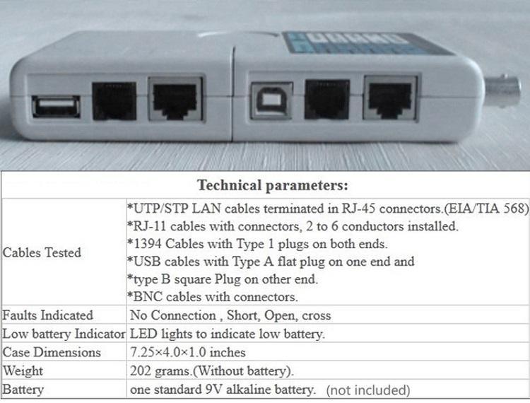 Lỗi chỉ định: Không có kết nối, ngắn, mở, cross chỉ báo pin thấp: đèn LED để chỉ pin thấp Pin: pin kiềm 9V (không bao gồm)