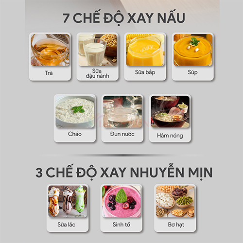 7 chương trình nấu được cài đặt sẵn: sữa đậu nành, sữa bắp, súp, trà, cháo, đun nước, hâm nóng/giữ ấm kết hợp với 3 chương trình xay: sinh tố, sữa lắc, tự làm sạch đa dạng thực đơn chế biến hàng ngày.