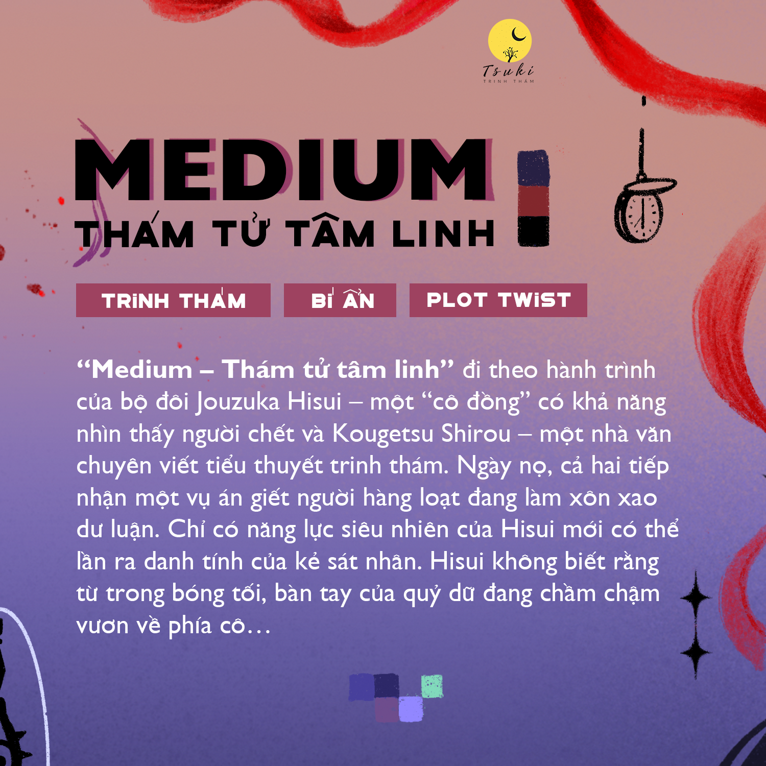 “MEDIUM – Thám tử tâm linh” đi theo hành trình của bộ đôi Jouzuka Hisui – một “cô đồng” có khả năng nhìn thấy người chết và Kougetsu Shirou – một nhà văn chuyên viết tiểu thuyết trinh thám. Ngày nọ, cả hai tiếp nhận một vụ án giết người hàng loạt đang làm xôn xao dư luận. Chỉ có năng lực siêu nhiên của Hisui mới có thể lần ra danh tính của kẻ sát nhân. Hisui không biết rằng từ trong bóng tối, bàn tay của quỷ dữ đang chầm chậm vươn về phía cô…