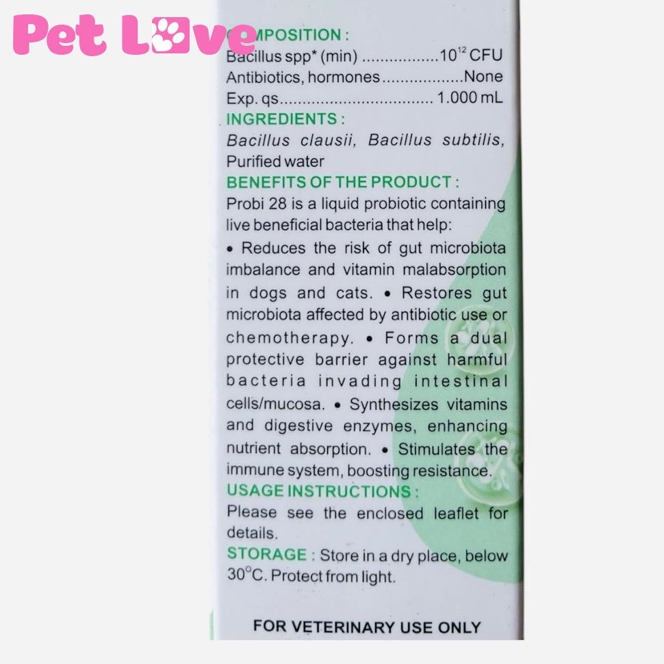 Vemedim Probi 28 Men Vi Sinh với 5 tỷ Lợi Khuẩn Vượt Trội, Bảo Vệ Đường Ruột cho Chó Mèo THÀNH PHẦN: Bacillus spp* (min) 10mũ12 CFU Kháng sinh, hormon không có Dung môi (nước tinh