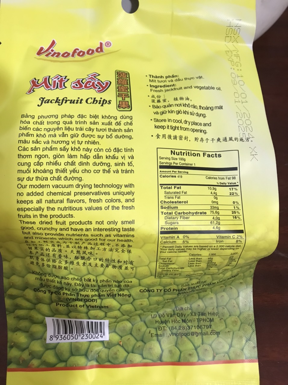 Mua tại TiktokMÔ TẢ SẢN PHẨM Tên sản phẩm: Mít sấy chân không VINO. Thương hiệu: VINOFOOD Dòng sản phẩm: Xuất khẩu – Export Phương pháp sấy: Sấy chân không. Thành phần: Mít chín và Dầu thực vật. Đặc tính: Ngọt tự nhiên không thêm đường, Không sử dụng phẩm màu và chất bảo quản, Sản phẩm giòn xốp mà vẫn giữ được hương vị thơm ngon, vị ngọt thanh tự nhiên …màu sắc tươi nguyên và bảo toàn được giá trị dinh dưỡng. Đóng gói: