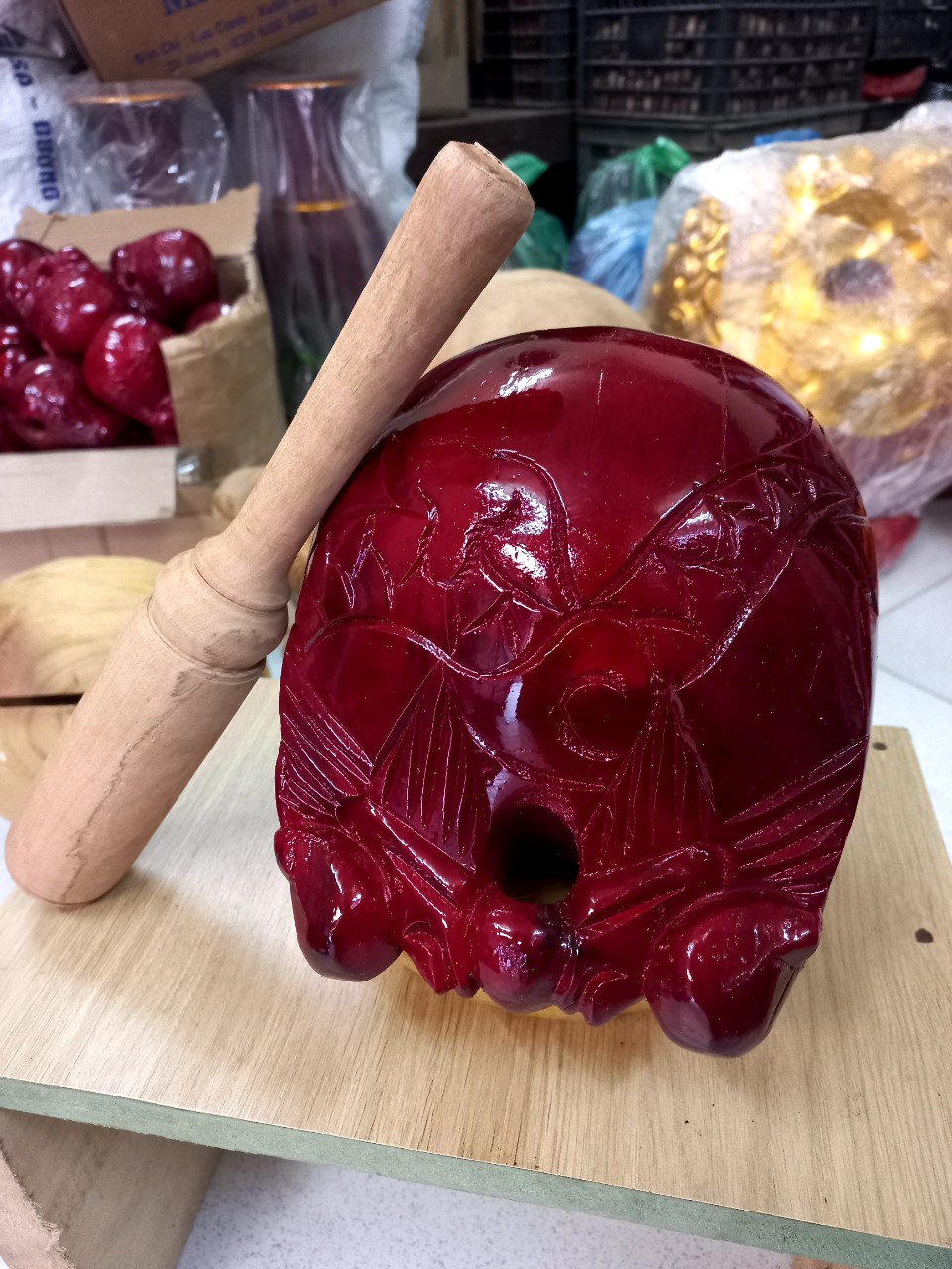 _ Mõ tụng kinh niệm phật được làm bằng chất liệu gỗ mít liền khối tự nhiên 100% ,Và được sơn pu phun mầu mận chín _ Kích thước 12cm + dùi đánh và đế