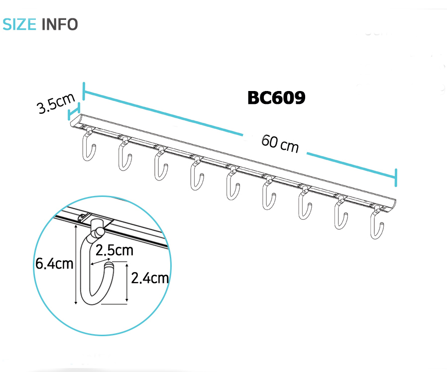 - Model: BC609 - Vật liệu: Nhôm, polycarbonate - Kích thước: 600x 40mm - Đặc tính sản phẩm: Có thể di chuyển vị trí móc theo mong muốn. - Tải trọng/móc: 2kg - Bảo hành