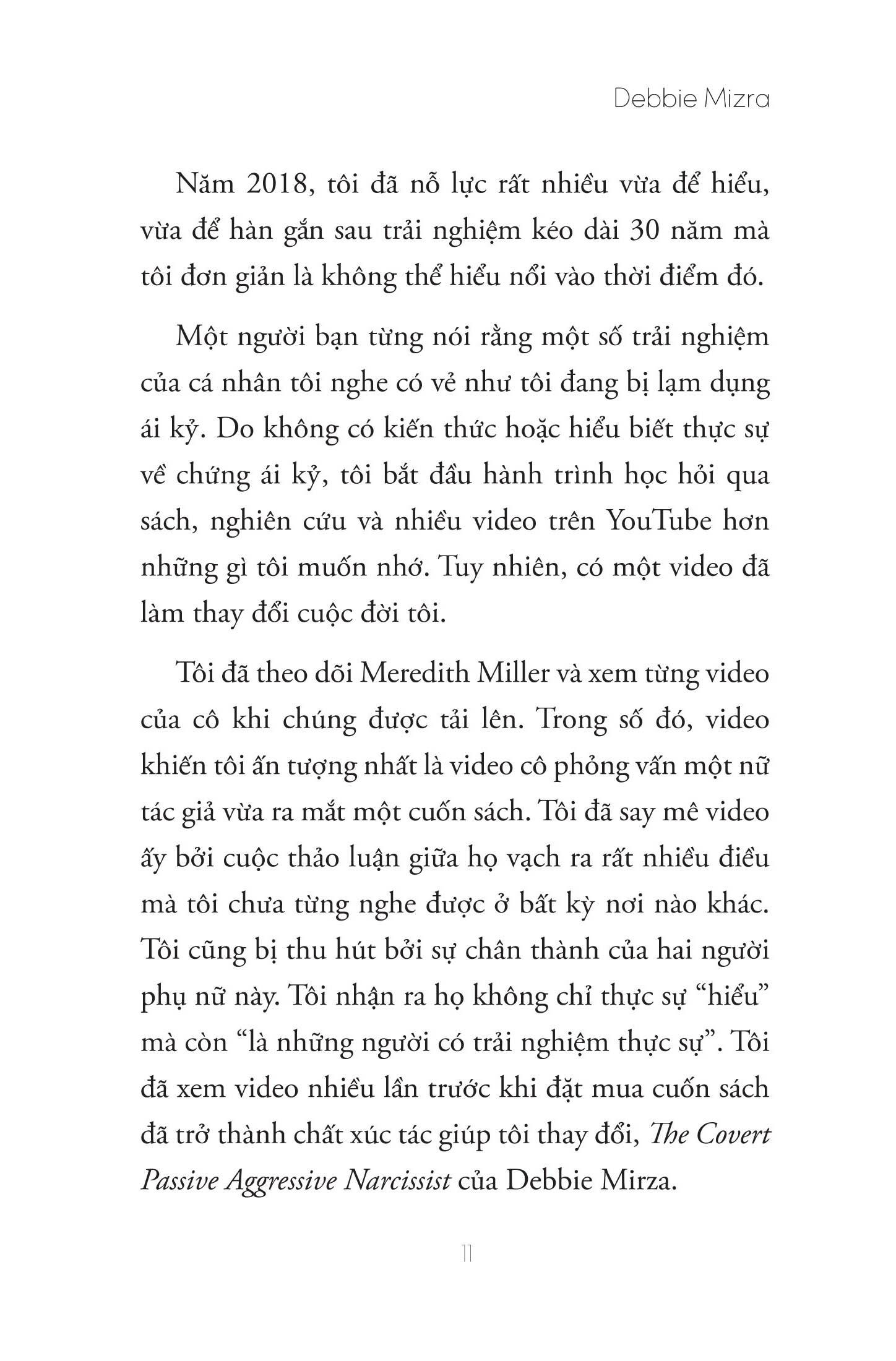 - Các bài tập giúp điều chỉnh hệ thống thần kinh của bạn sau nhiều năm bị tổn thương Những nhận xét về cuốn sách: Cuốn sách này sẽ giải đáp thỏa đáng những câu hỏi đầy dằn vặt sau: “Làm sao tôi lại để m.ình bị đối xử như vậy?” “Liệu tôi có bao giờ được trở lại là chính m.ình nữa không?” “Làm sao tôi biết nên tin ai?” -Abby Rodman, Nhà trị liệu tâm lý, người đồng dẫn chương trình podcast Sisters Cracking Up- Thông tin tác giả Debbie Mirza là huấn luyện viên phục hồi, tác giả và ca sĩ/nhạc sĩ. Trong quá trình huấn luyện của m.ình, cô đã có cơ hội làm việc trực tiếp với những người đã đang trong những mối quan hệ với những người ái kỷ bí mật. Chính vì thế, tác phẩm của cô tập trung giải thích đặc điểm của kiểu người ái kỷ quỷ quyệt nhất, từ đó xác định mức độ ảnh hưởng tiềm năng của chứng rối loạn này đến bạn và cách chữa lành nếu bạn vô tình rơi vào một mối quan hệ như thế