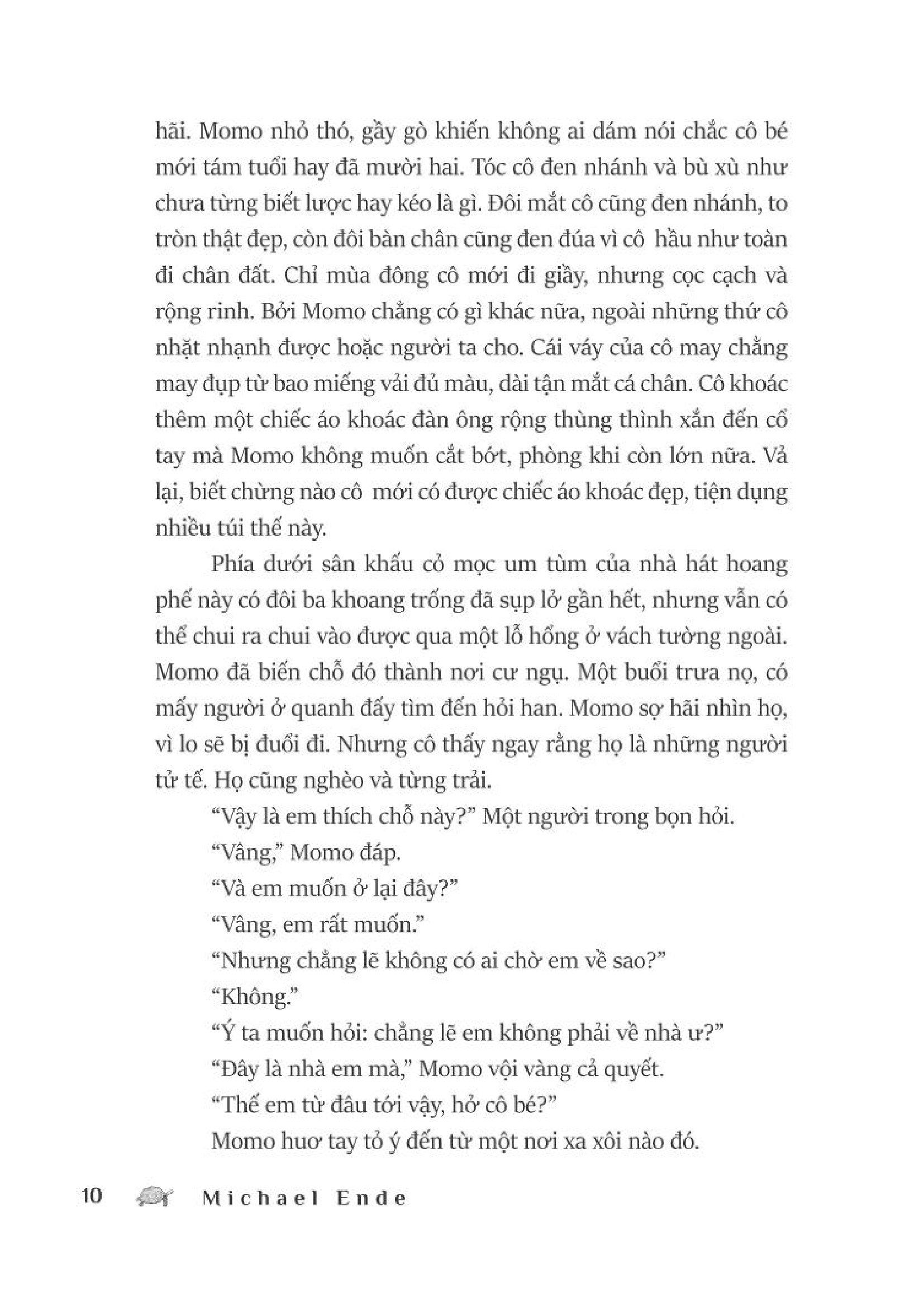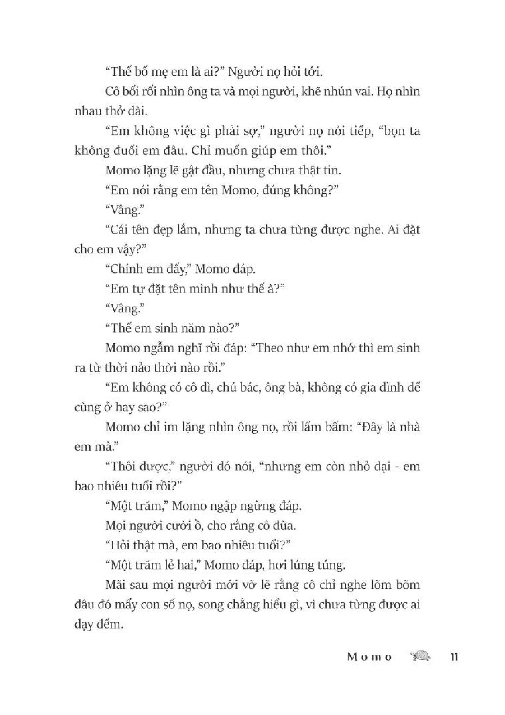 Momo sống ở rìa một thành phố lớn trong một nhà hát lộ thiên đổ nát. Cô bé không có gì ngoài những thứ tự m.ình tìm được hay mọi người tặng cho, và một khả năng kì lạ: Cô bé luôn có thời gian và khả năng lắng nghe người khác. Một ngày kia, những gã màu xám bắt tay vào thực hiện một kế hoạch. Chúng cầm giữ thời gian quý báu của con người và Momo là người duy nhất còn có thể ngăn chặn được chú