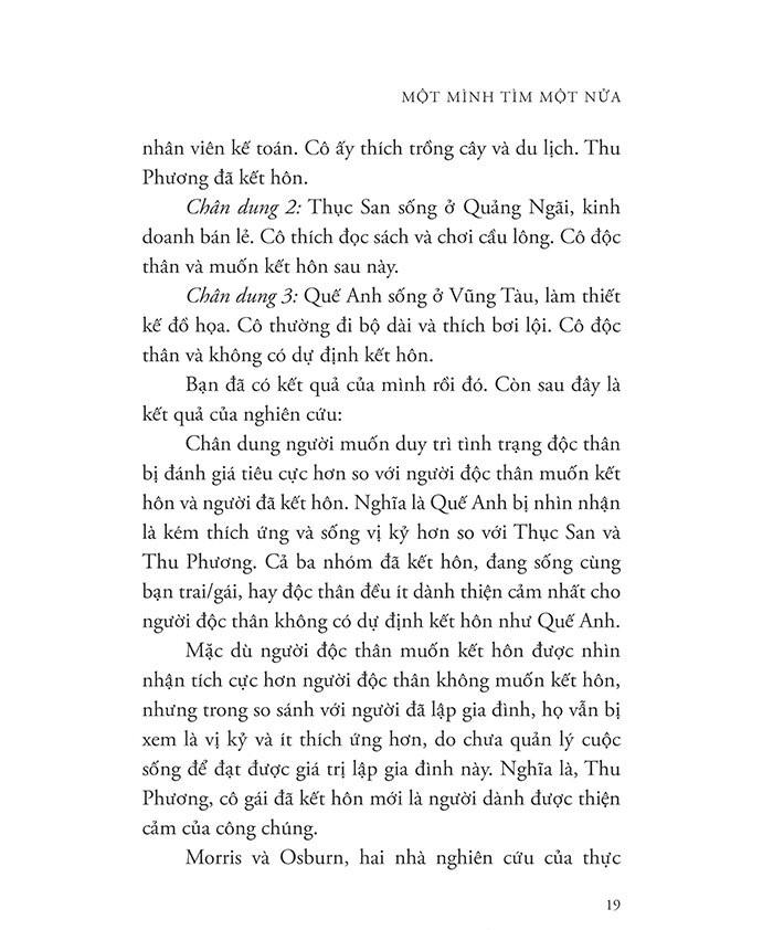 Cuốn sách này sẽ đồng hành cùng tất cả chúng ta - những người còn độc thân, đang phân vân trước ngã rẽ tình cảm, hoặc đã ở trong một mối quan hệ đôi lứa - trên hành trình hiểu về tình yêu và hiểu về chính mình. Vì hạnh phúc không chỉ có một dáng vẻ duy nhất.