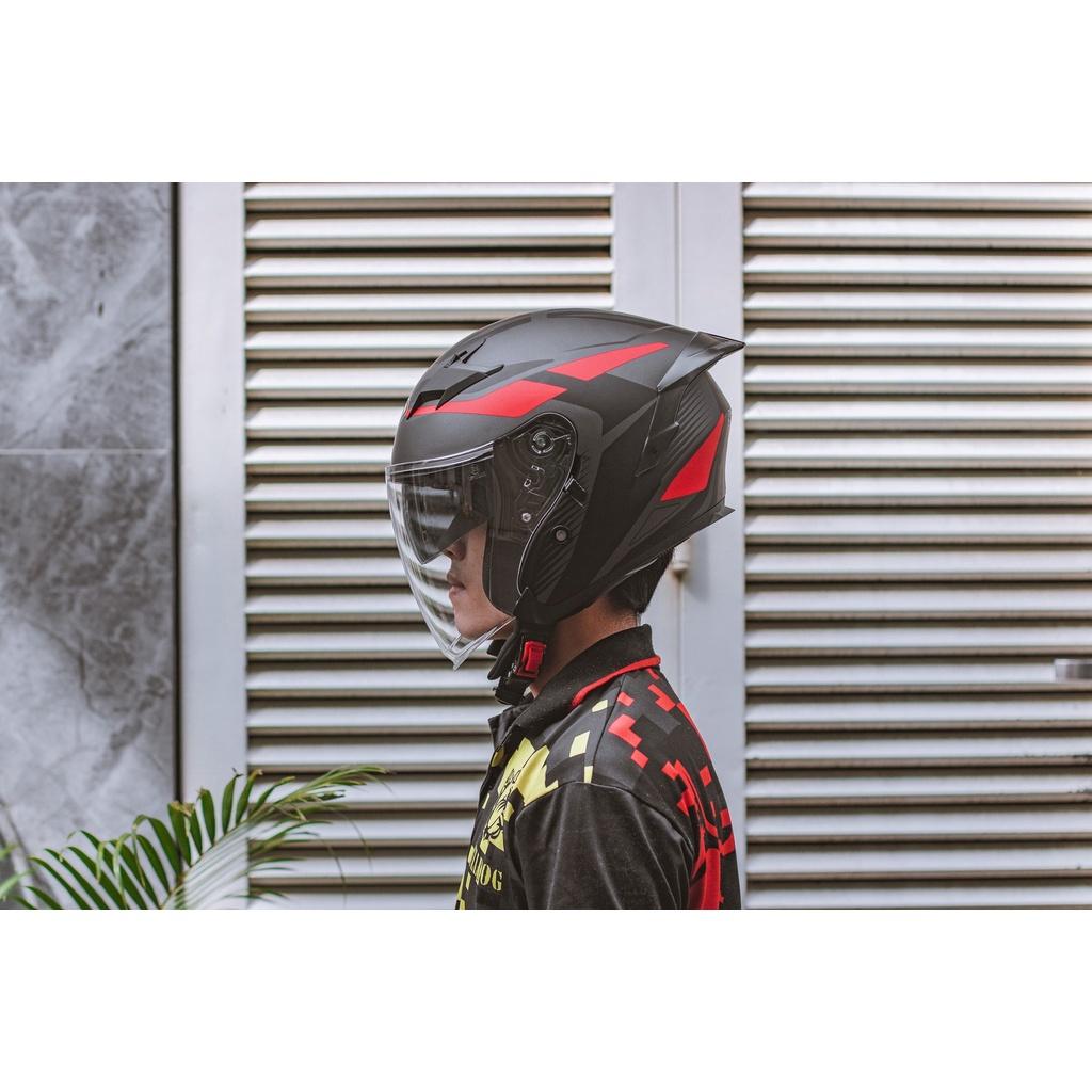Mũ bảo hiểm được trang bị lớp kính giấu bên trong, có thể kéo ra giấu vào tùy theo nhu cầu sử dụng. Ngoài ra, nón còn đính kèm 3 khuy bấm phía trên mũ,