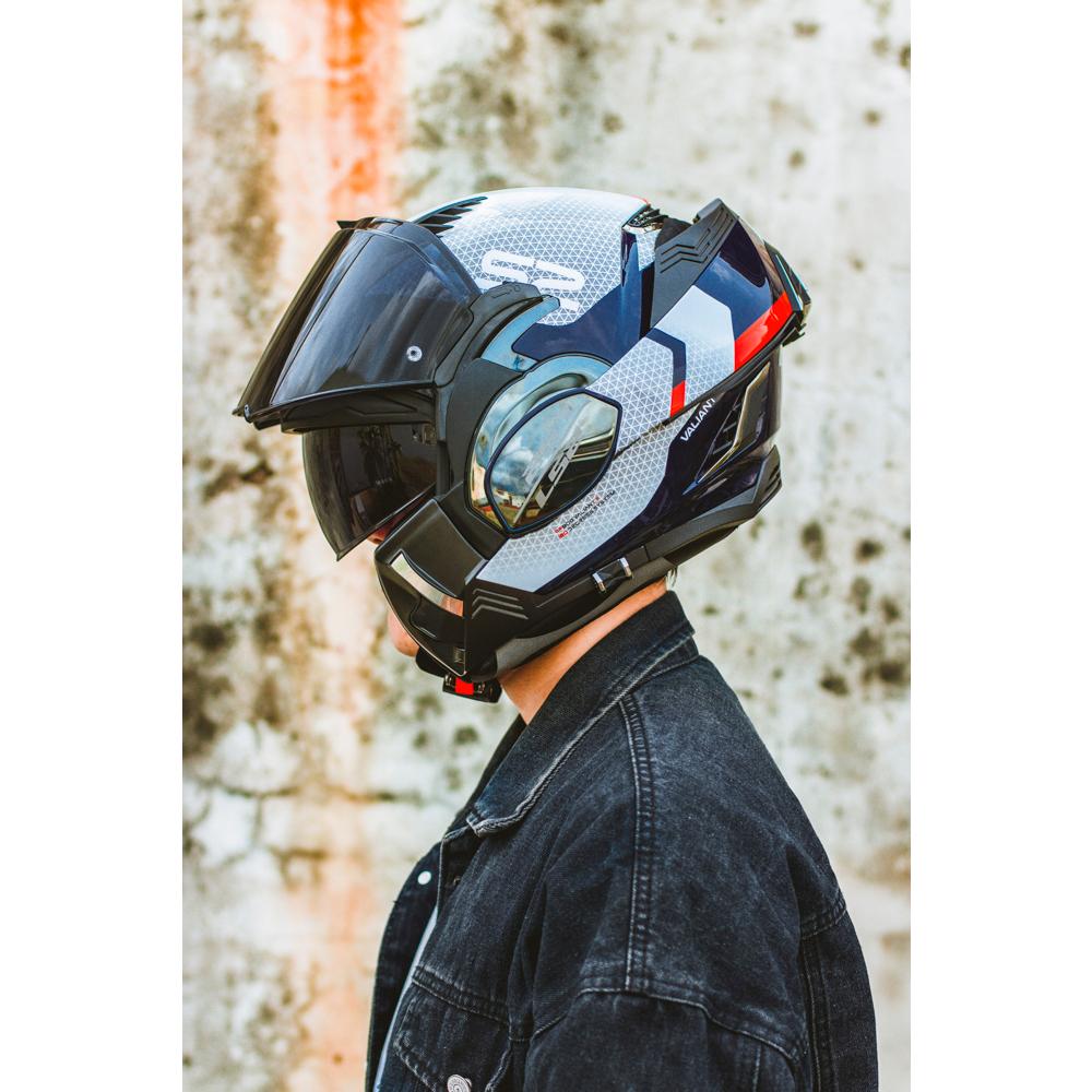 Bên cạnh kính chắn ngoài, mũ còn có thể nâng cấp thêm kính phụ màu tối bên trong giúp bảo vệ mắt người đội khỏi ánh nắng mặt trời. Kính trong có thể di chuyển lên, xuống dễ dàng nhờ hệ thống lật mở nhanh chóng được bố trí bên hông mũ. Cho phép người dùng nhanh chóng lật kính trong lên khi di chuyển vào những khu vực thiếu sáng như đường hầm.
