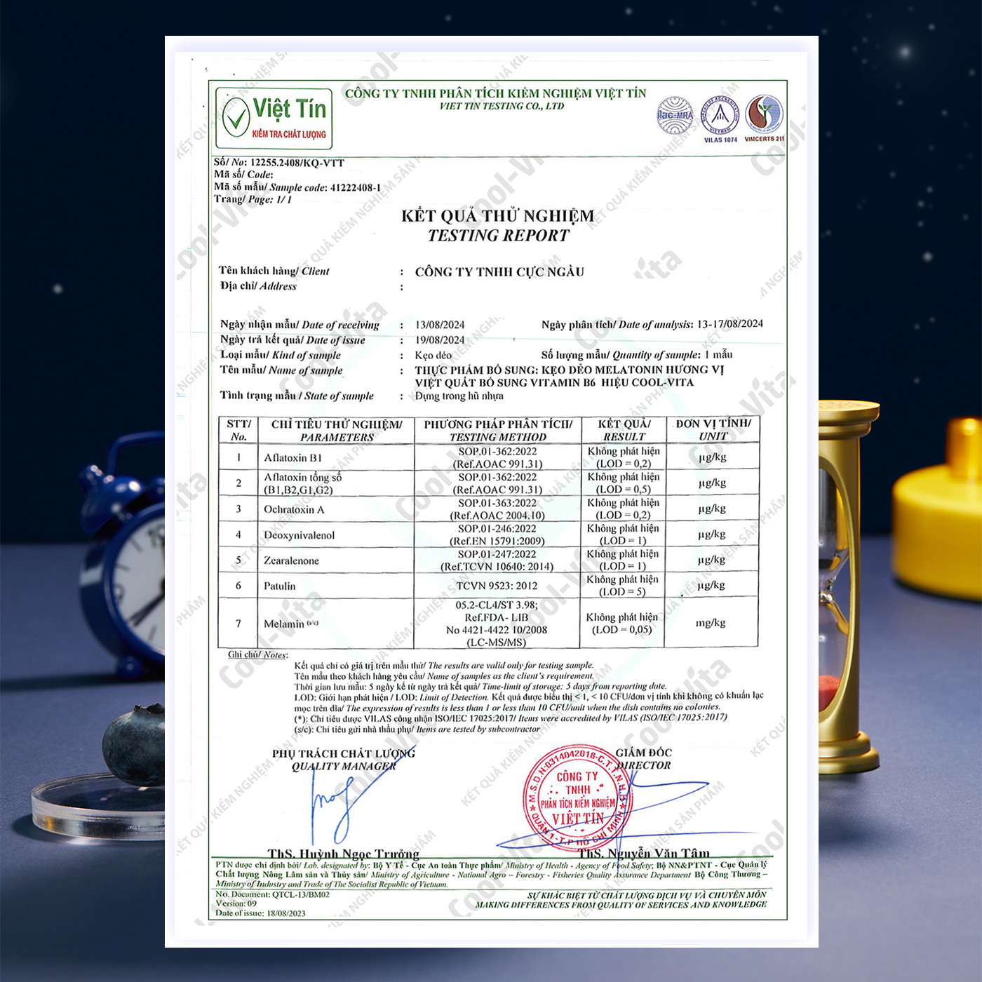 - (Tặng) 1 Hộp Nước Uống Collagen Cao Cấp Cool-Vita 3000mg Collagen Peptide (45ml× 7 túi)/hộp Bạn đang gặp khó khăn khi đi vào giấc ngủ? Vậy thì đừng nên bỏ qua Kẹo Dẻo Melatonin Vị Việt Quất của CoolVita! Kẹo Dẻo Melatonin CoolVita Vị Việt Quất Kết Hợp Vitamin B6 hỗ trợ điều chỉnh chu kỳ giấc ngủ và hỗ trợ cải thiện chất lượng giấc ngủ ngon hơn. Với 6mg melatonin trong mỗi 2 viên kẹo, kết hợp cùng vitamin B6 hỗ trợ giảm căng thẳng, có một đêm ngủ ngon và sâu hơn. Công dụng nổi bật: Hỗ trợ cải thiện chất lượng giấc ngủ: Mỗi 2 viên kẹo dẻo chứa 6mg Melatonin kết hợp Vitamin B6 hỗ trợ điều chỉnh chu kỳ giấc ngủ tự nhiên, giúp bạn dễ dàng đi vào giấc ngủ và duy trì giấc ngủ sâu suốt đêm. Hỗ trợ giúp thư giãn trước khi ngủ: Vitamin B6 giúp tạo cảm giác thư giãn trước khi ngủ, giúp cơ thể dễ dàng đi vào giấc ngủ. An toàn và lành mạnh: Kẹo Dẻo Melatonin CoolVita không phải là thuốc ngủ, hỗ trợ bạn ngủ ngon hơn. Nguyên liệu từ thực vật: Được làm bằng pectin từ thực vật thay vì gelatin, sản phẩm an toàn cho sức khỏe và phù hợp với chế độ ăn chay. Đặc điểm sản phẩm: Hương vị thơm ngon: Vị việt quất chua ngọt dễ chịu, kẹo dẻo mềm mịn, ngon miệng, không gây dính răng. Dễ sử dụng: Sản phẩm được chế biến thành dạng kẹo dẻo nhai tiện lợi. Tiện lợi mang theo: Hộp nhựa nhỏ gọn, dễ dàng mang theo khi đi công tác hoặc du lịch. Thành phần: Đường trắng tinh luyện, Siro mạch nha (48%), chất làm dày (Pectin), chất điều chỉnh độ acid: Acid citric, hương liệu quả việt quất tự nhiên, dầu thực vật (chứa chất chống đông vón: Sáp carnauba), Vitamin B6 (dạng Pyridoxin hydrochloric 0,13%), Melatonin (0,12%), Maltodextrin, chất tạo màu tự nhiên. Nước ép trái cây và rau quả. Khối lượng tịnh: 180g (60 viên x 3g) Hướng dẫn sử dụng: