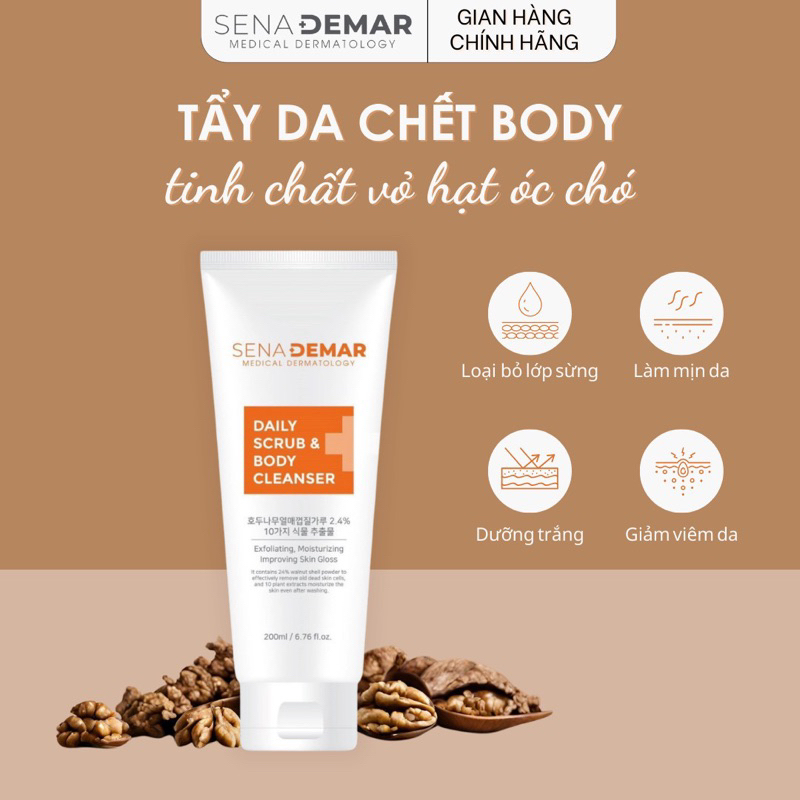 Sữa tắm tẩy tế bào chết body SENADEMAR 200ml trắng da,sáng mịn.   ️THÔNG TIN SẢN PHẨM ️ Thương hiệu: SENADEMAR ️ Xuất Xứ: Hàn Quốc ️ Dung Tích: 200ml ️ Hạn Sử Dụng: 24 Tháng ️ THÀNH PHẦN: ️ 24000ppm Bột Vỏ Hạt Óc Chó ️ Sáng Chế Derma-clera ️ 8 Loại Hyaluronic ️ Các Thành Phần Chiết Xuất Tự Nhiên   ️CÔNG DỤNG SẢN PHẨM: ️ Sản phẩm giúp loại bỏ lớp sừng da chết và bã nhờn, làm thông thoáng lỗ chân lông. ️ Cấp ẩm, giảm viêm da, bật tone nhẹ nhàng và làm mịn da ngay lần đầu tiên sử dụng.   ️ HƯỚNG DẪN SỬ DỤNG: ️ Làm ướt cơ thể với nước ấm. ️ Thoa một lượng vừa đủ lên da hoặc sử dụng bông tắm để tạo bọt. ️ Nhẹ nhàng massage body với hạt óc chó. ️ Rửa sạch lại bằng nước ấm.   ️BẢO QUẢN: ️ Bảo quản nơi khô ráo thoáng mát, tránh ánh nắng trực tiếp của mặt trời.