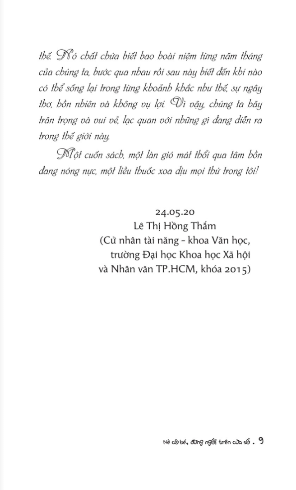 Mua tại Tiktok“Bạn có bao giờ nghe đến câu “Tình yêu sét đánh” chưa? Tôi chắc chắn là bạn đã được nghe ở đâu đó rồi, đúng không? Cũng hợp lý thôi vì chủ đề về tình yêu luôn được bàn tán rất nhiểu và ai rồi cũng sẽ trải qua ít nhất một lần trong đời. Đặc biệt, tình yêu ở lứa tuổi còn khoác chiếc áo trắng tinh khôi luôn là một chủ đề cuốn hút hơn cả. Bởi đó là tình yêu tuổi học trò mang dư vị của sự ngây ngô mới lớn, những rung động chớm nở đầu đời tinh khiết như những giọt sương sớm mai… Và hơn thế, rung động đó sẽ trở thành một phần ký ức không thể quên trong mỗi chúng ta. Tác phẩm Nè cô bé, đừng ngồi trên cửa sổ đêm đến một thế giới như thế.”
