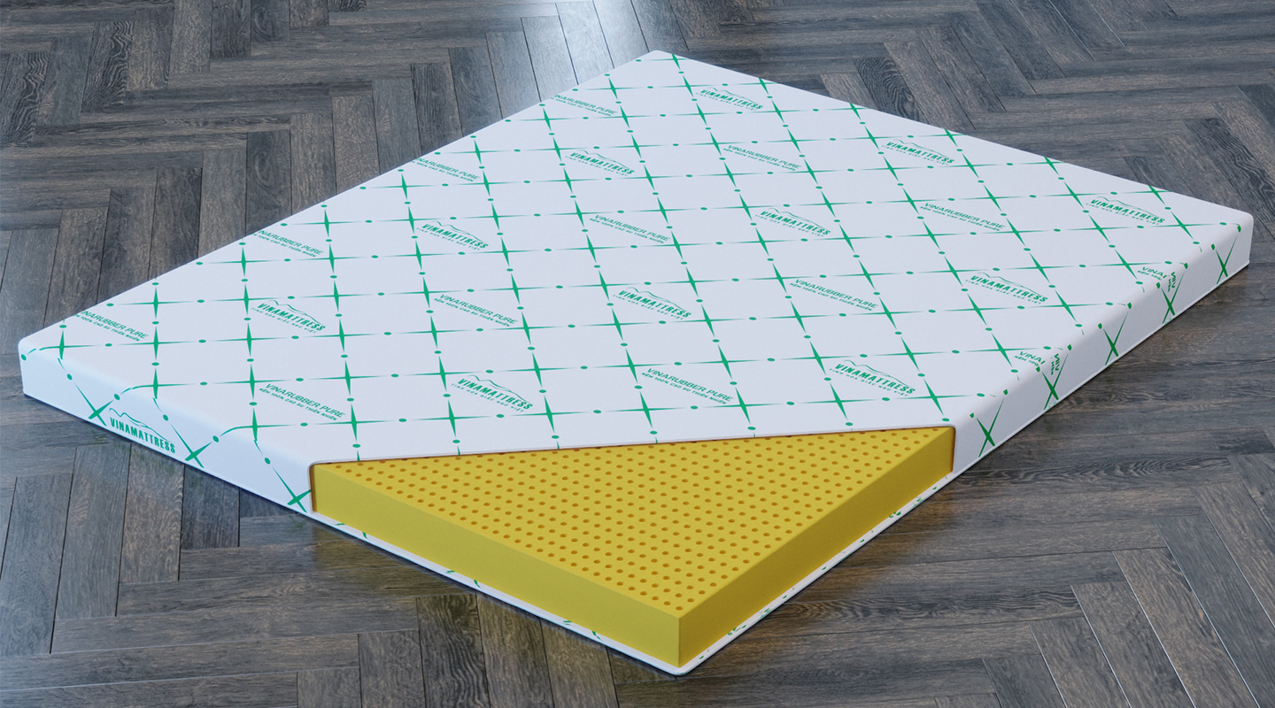 Nệm cao su Vinamattress mặt lổ vài thun xuyên kim Mô tả: Vinarubber Pure chọn lọc từ nguồn nguyên liệu 100% cao su thiên nhiên sạch khuẩn, mang thiết kế tinh giản với hơn 5000 lỗ