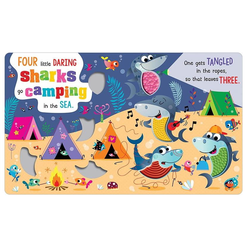 You must never touch the sharks . . . except in this book! Little ones will love counting down from five and watching the bumpy silicone sharks disappear at the turn of every page. With fun illustrations and a silly rhyme, this shark-themed counting book has plenty to explore. SHARK-THEMED SILICONE TOUCH AND FEEL COUNTING BOOK
