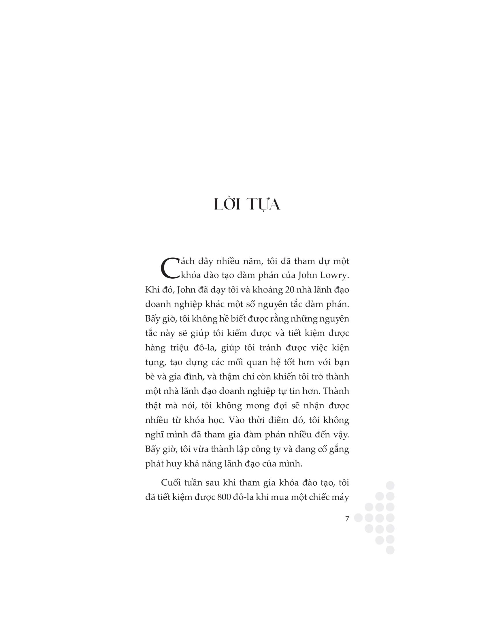 Cuốn sách này cung cấp một cách tiếp cận hữu ích và toàn diện để làm chủ cuộc đàm phán. Thông qua những lời khuyên hữu ích và hướng dẫn thực tế, tác giả John Lowry sẽ chỉ cho bạn cách gia nhập hàng ngũ những nhà lãnh đạo đã đạt được thành công chưa từng có bằng cách khiến việc thương thuyết trở nên đơn giản. Sự cần thiết của đàm phán được thể hiện trong mọi khía cạnh của đời sống, từ công việc đến cuộc sống đời thường. Phát triển kỹ năng đàm phán thuyết phục sẽ giúp bạn có thêm đạt được nhiều thành công, duy trì những mối quan hệ tốt đẹp và nâng cao hiệu quả khi giao tiếp.