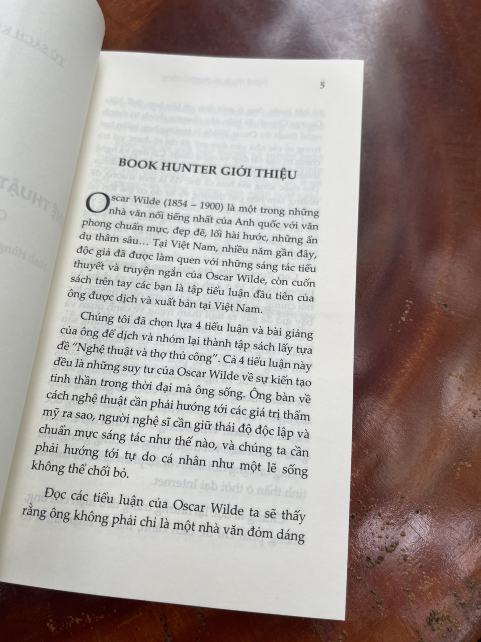 Book Hunter đã chọn lựa 4 tiểu luận và bài giảng của Oscar Wilde để dịch và nhóm lại thành tập sách lấy tựa đề “Nghệ thuật và thợ thủ công”. Cả 4 tiểu luận này đều là những suy tư của Oscar Wilde về sự kiến tạo tinh thần trong thời đại mà ông sống: Châu Âu thế kỷ 19 dưới thời đại trị vì của nữa hoàng Victoria.