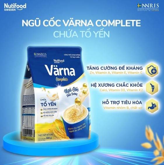 Sản phẩm này không phải là thuốc và không có tác dụng thay thế thuốc chữa bệnh  LỢI ÍCH SẢN PHẨM:  TĂNG CƯỜNG ĐỀ KHÁNG Vitamin C, Kẽm, vitamin AE giúp tăng cường hệ miễn dịch  HỆ XƯƠNG CHẮC KHOẺ Vitamin K2, Calcium, Vitamin D3 giúp ngăn ngừa loẵng xương hiệu quả  HỖ TRỢ TIÊU HÓA Chất xơ hỗ trợ đường ruột khoẻ mạnh kết hợp với Vitamin nhóm B giúp hấp thu chất dinh dưỡng tốt hơn  TỐT CHO TIM MACH Vitamin K2 giúp ngăn ngừa xơ vữa động mạch và bảo vệ tim mạch    THÀNH PHẦN: Chất béo thực vật (xi-rô glucose, dầu thực vật, đạm sữa, chiết xuất đại mạch), ngũ cốc (33%) (bột mì, bột mì nguyên cám, xi-rô glucose, chiết xuất đại mạch, bột gạo, đường sucrose, bột đậu nành, bột bắp), đường sucrose, chất xơ thực phẩm (FOS/ Inulin), vitamin và khoáng chất (tricalci phosphat, natri clorid, natri-L-ascorbat, niacinamid, calci-D-pantothenat, pyridoxin hydroclorid, thiamin mononitrat, menaquinon, retinyl acetat, cholecalciferol, DL-alpha tocopheryl acetat, kẽm oxyd), hương liệu tổng hợp dùng cho thực phẩm, tổ yến tinh chế (50 mg/100g). Sản phẩm chứa các nguyên liệu có nguồn gốc từ đại mạch, lúa mì, đậu nành, sữa.    ĐẶC ĐIỂM NỔI BẬT CỦA SẢN PHẨM: Ứng dụng TINH HOA KHOA HỌC DINH DƯỠNG CHÂU ÂU cùng hơn 20 năm am hiểu sâu sắc thể trạng đặc thù của người lớn người ăn uống kém tại Việt Nam từ CHUYÊN GIA DINH DƯỠNG NUTIFOOD. NGŨ CỐC DINH DƯỠNG VÄRNA COMPLETe MỚI chứa TỔ YẾN TINH CHẾ bổ dưỡng được kiểm chứng bởi VIỆN NGHIÊN CỨU DINH DƯỠNG NUTIFOOD THỤY ĐIỂN - NNRIS cung cấp nguồn dinh dưỡng tuyệt vời từ NGŨ CỐC NGUYÊN CÁM kết hợp cùng 12 VITAMIN KHOÁNG CHẤT thiết yếu giúp duy trì HỆ XƯƠNG KHỎE MẠNH, HỖ TRỢ TIÊU HÓA và TĂNG CƯỜNG SỨC ĐỀ KHÁNG.    HƯỚNG DẪN SỬ DỤNG: Pha một gói 25g ngũ cốc dinh dưỡng với khoảng 130 – 150ml nước nóng, khuấy đều và dùng ngay.  QUY CÁCH: Thùng 14 Túi - Túi 500g  ĐỘ TUỔI SỬ DỤNG: Người trưởng thành trên 19 tuổi  HẠN SỬ DỤNG: 12 tháng kể từ ngày sản xuất  NƠI SẢN XUẤT: Việt Nam