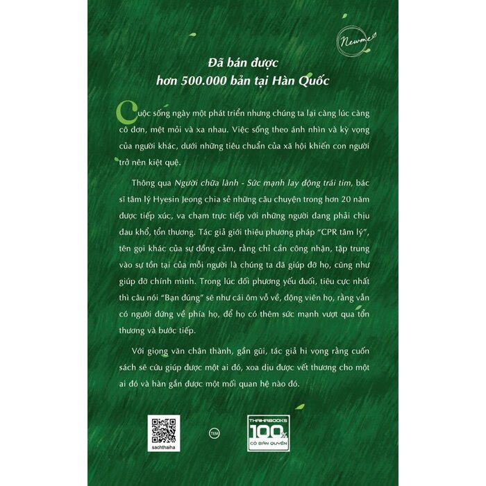 Người Chữa Lành - Sức Mạnh Lay Động Trái Tim là tâm huyết của bác sĩ tâm lý Hyesin Jeong sau hơn 20 làm việc, tiếp xúc, va chạm trực tiếp với những người đang