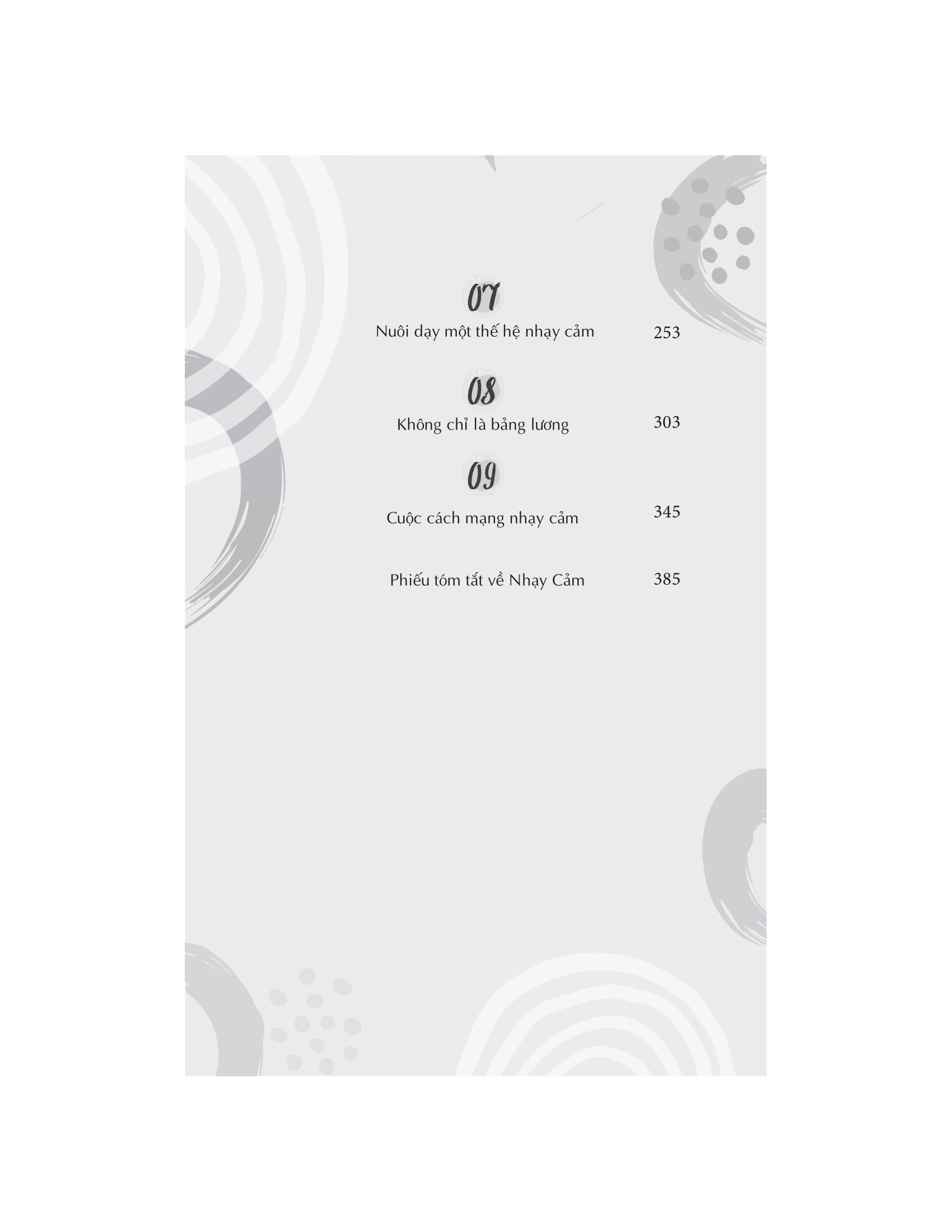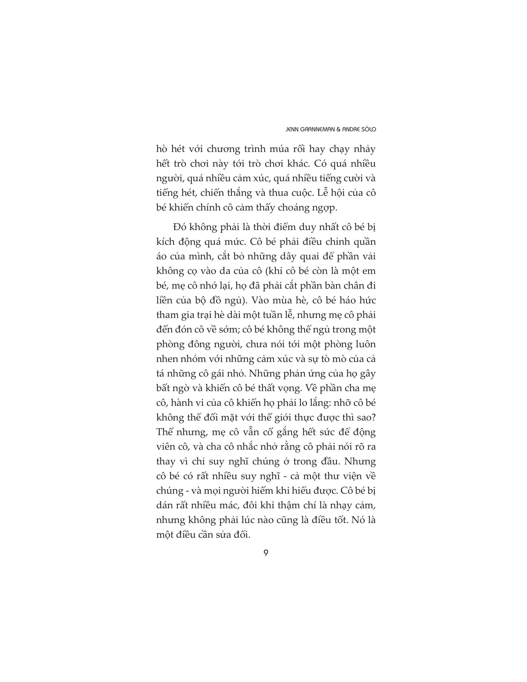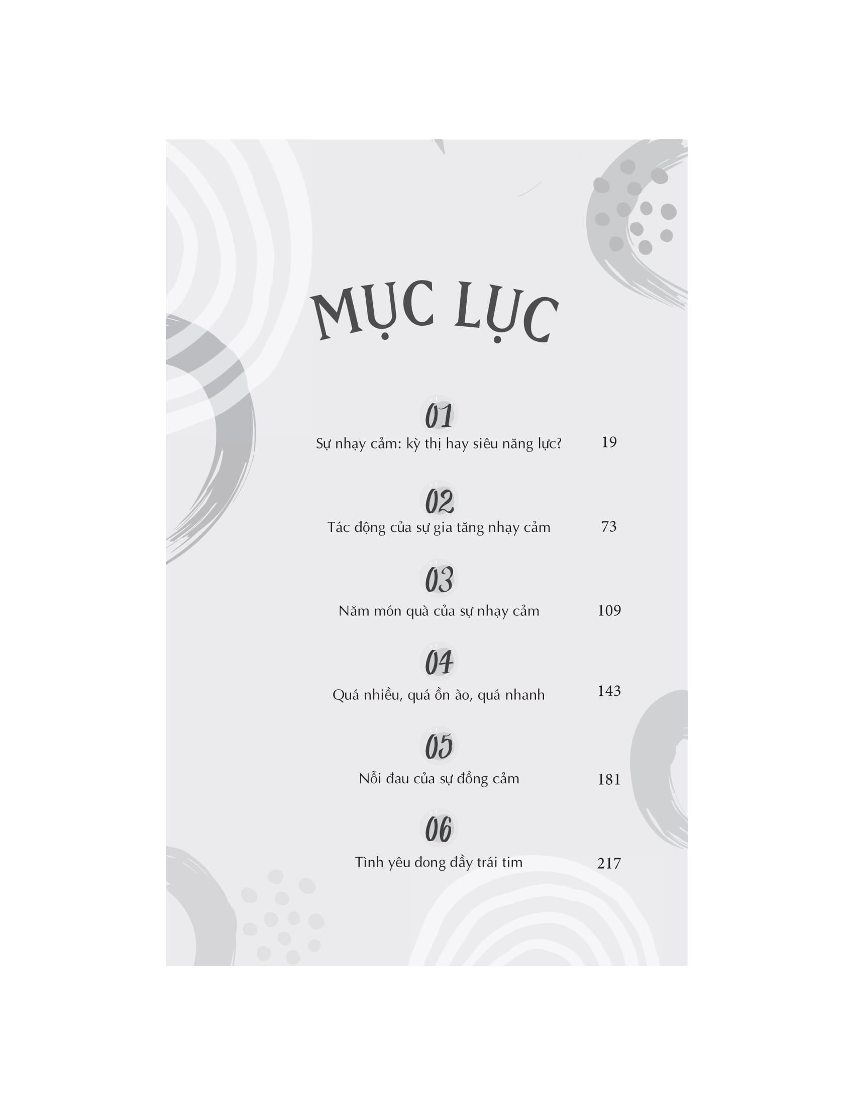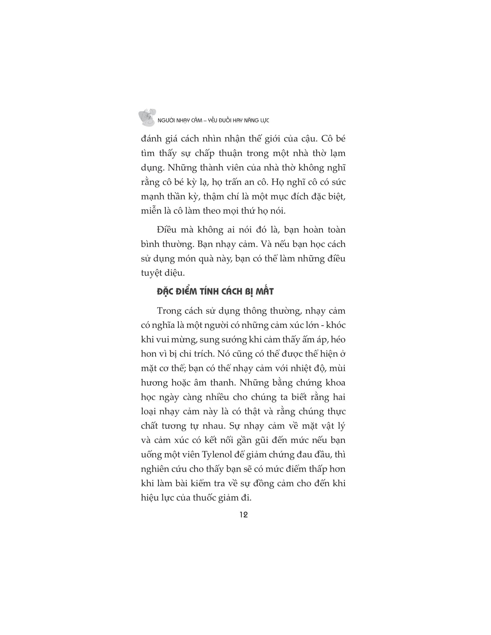 Người nhạy cảm đều có quyền lựa chọn con đường riêng của họ. Nhưng có một bước mà tất cả chúng ta đều phải thực hiện và nó là bước khó khăn nhất: ngưng nhìn nhận sự nhạy cảm là một khiếm khuyết và bắt đầu coi nó là một món quà. Cuốn sách chứa đầy cảm hứng này sẽ thay đổi mãi mãi cách chúng ta nhìn nhận những người nhạy cảm và cách họ nhìn nhận chính m.ình.