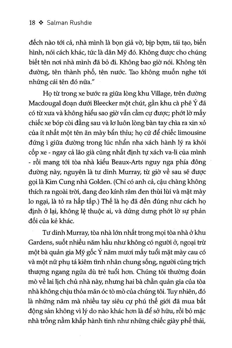 Cuộc tái hồi chủ nghĩa hiện thực đầy ngạo nghễ của Salman Rushdie được đánh dấu bằng “Nhà Golden” - một áng dụ ngôn bi tráng về nước Mỹ hiện đại. Lấy hai đầu mốc thời gian là thời điểm bắt đầu và kết thúc tám năm triều đại Obama, Nhà Golden xoay quanh số phận của bốn cha con từ vùng đất không được gọi tên đột ngột xuất hiện giữa trời New York một ngày định mệnh. Họ rũ bỏ quá khứ như rắn lột da, họ làm một phép biến hình như trong sử thi Ovid, và họ đâu ngờ chính họ là những kiến trúc sư cho cuộc sụp đổ của chính m.ình. Bằng thứ tiếng Anh khẩn trương và nóng rẫy như bầu không khí Ấn Độ quê hương, Rushdie đã đanh thép vạch mặt thiên đường tự do Mỹ trong cuộc khủng hoảng căn tính dai dẳng, trên nền bối cảnh náo động an ninh và tao loạn chính trị…