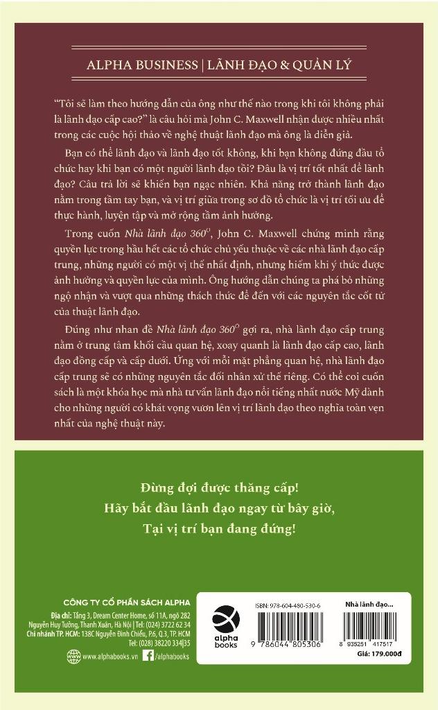 Trong cuốn Nhà lãnh đạo 360 độ, John C. Maxwell chứng minh rằng quyền lực trong hầu hết các tổ chức chủ yếu thuộc về các nhà lãnh đạo cấp trung, những người có một vị thế nhất định, nhưng hiếm khi ý thức được ảnh hưởng và quyền lực của m.ình. Ông dẫn dắt chúng ta đi từ những ngộ nhận và thách thức phải vượt qua để đến với các nguyên tắc cốt tử của thuật lãnh đạo.