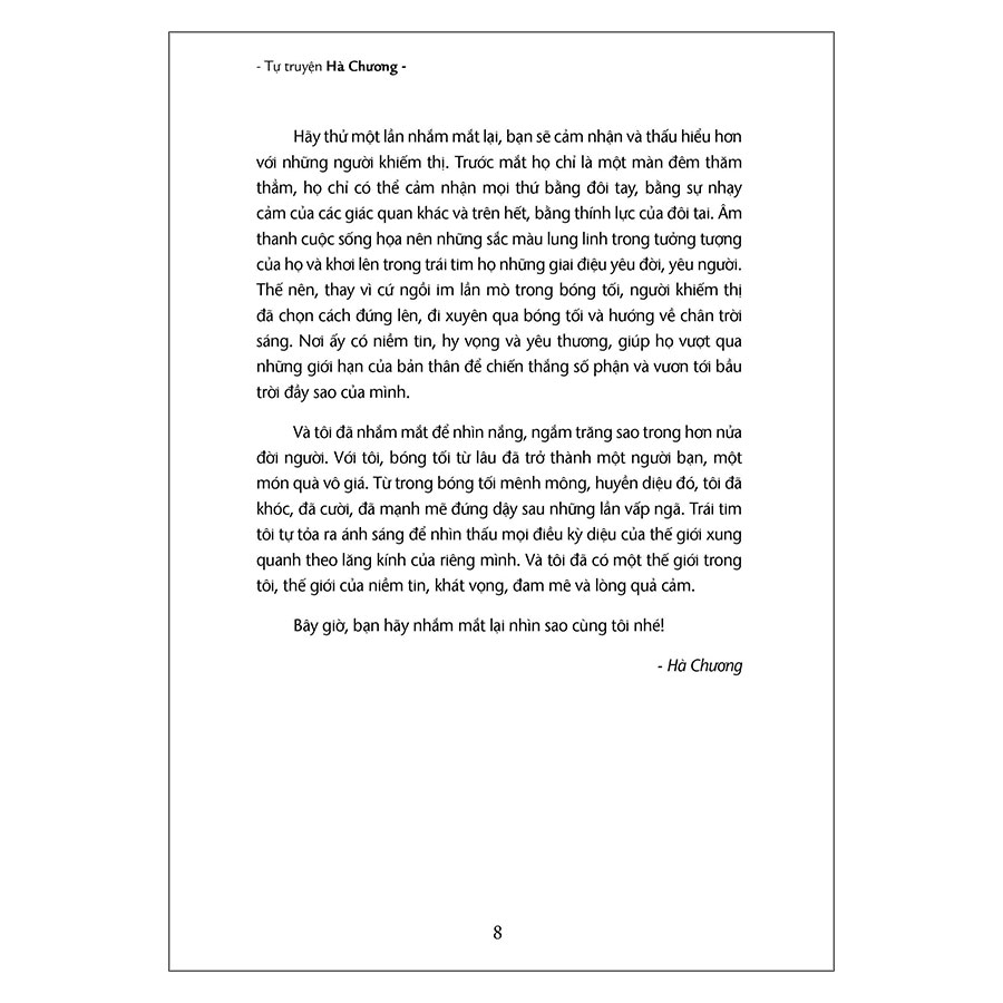 Anh đã nhắm mắt để nhìn nắng, ngắm trăng sao trong hơn nửa đời người. Từ trong bóng tối mênh mông, huyền diệu đó, anh đã khóc, đã cười, đã mạnh mẽ đứng dậy sau những lần vấp ngã. Trái tim đã tự tỏa ra ánh sáng để nhìn thấu mọi điều kỳ diệu của thế giới xung quanh theo lăng kính của riêng mình. Vì vậy thế giới của Hà Chương là thế giới của niềm tin, khát vọng, đam mê và lòng quả cảm.